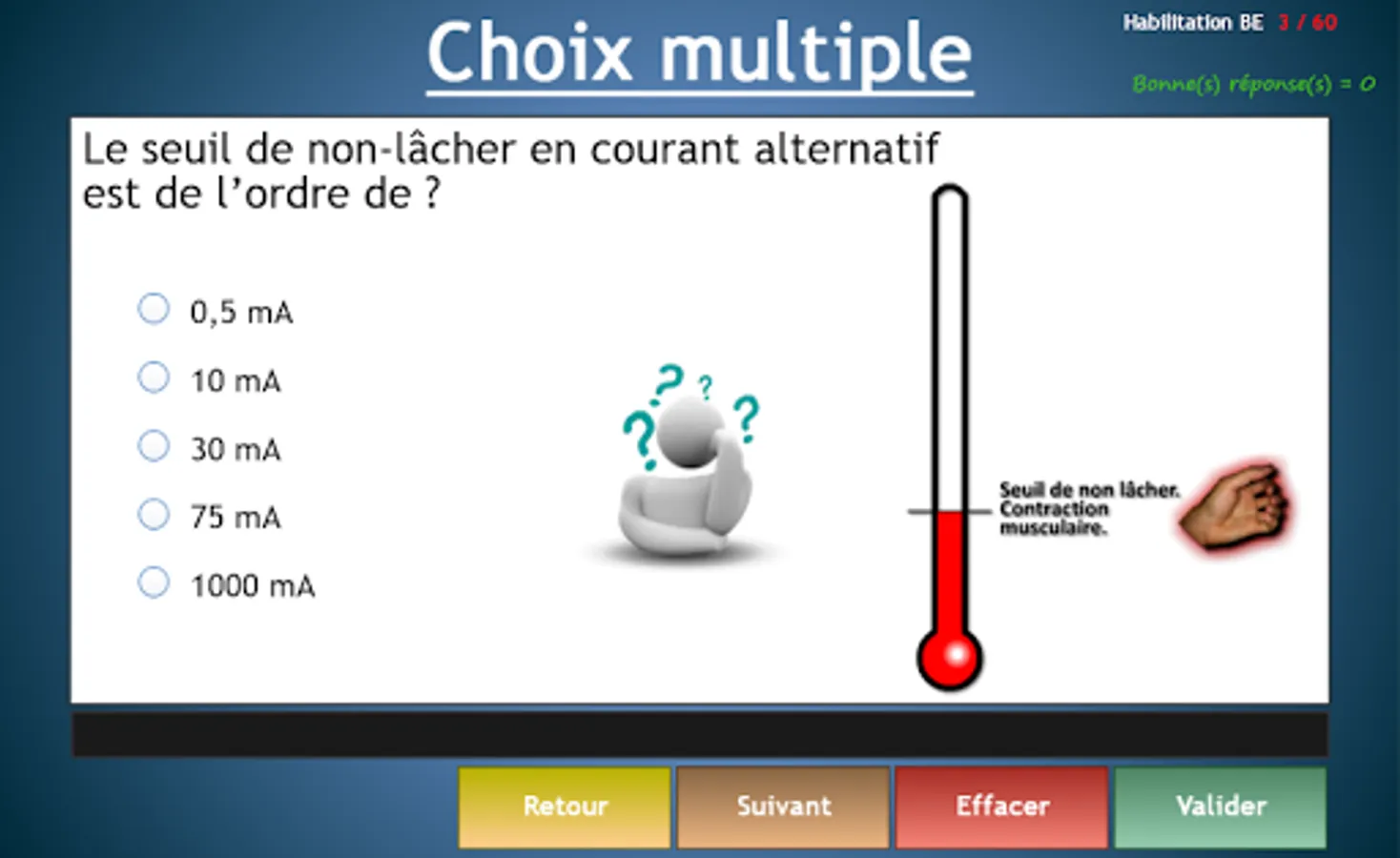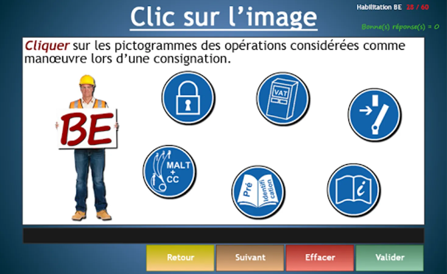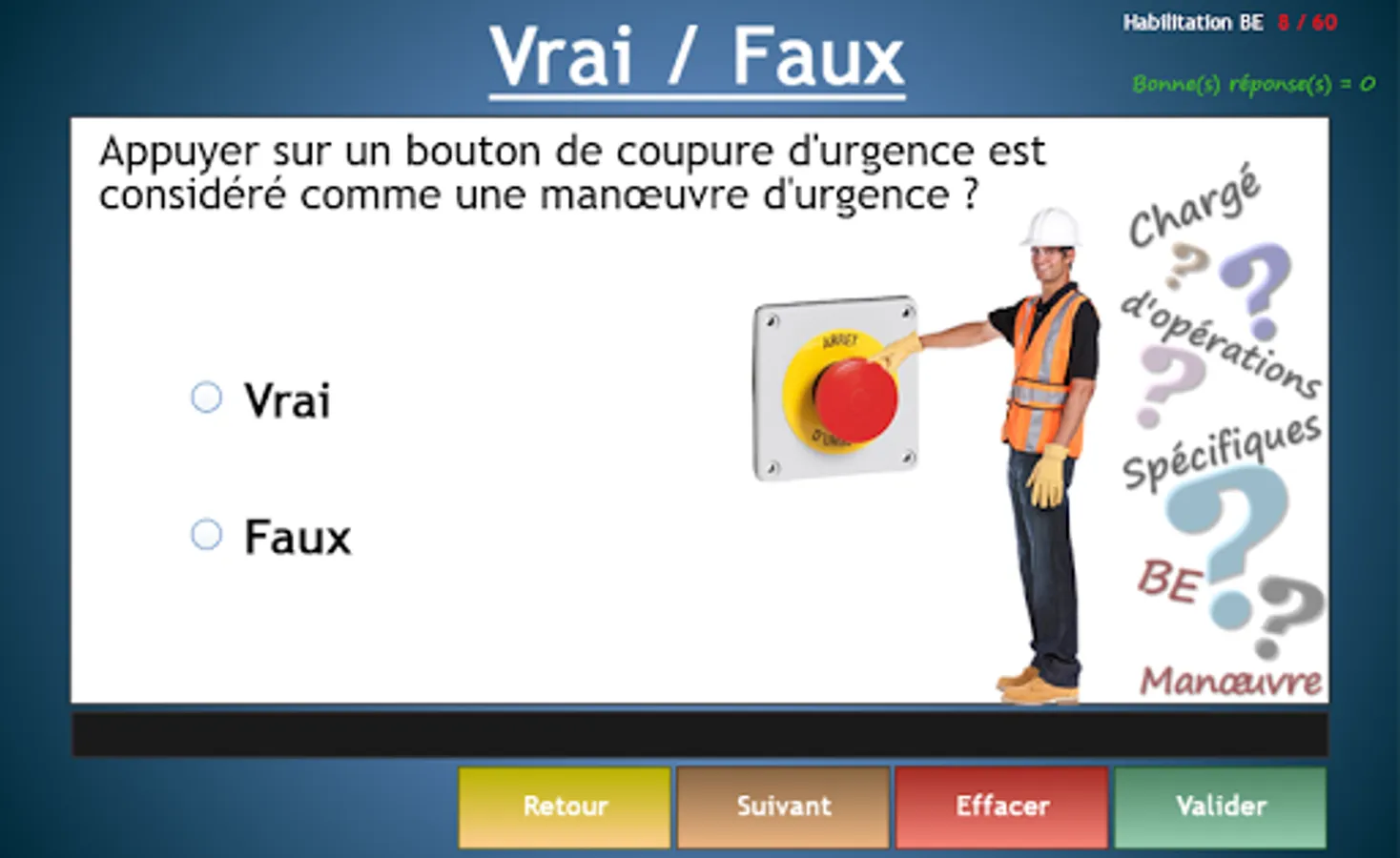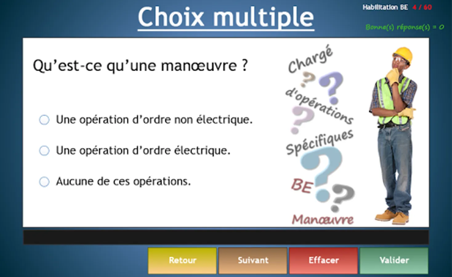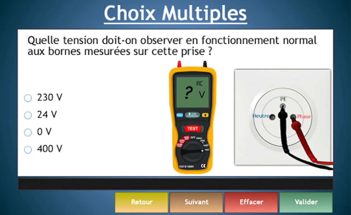 This questionnaire makes it possible to check one's knowledge, to review the key points and to prepare one's recycling for the BE (Specific Low Voltage Operations) electrical qualification for tests, measurements, checks or maneuvers.