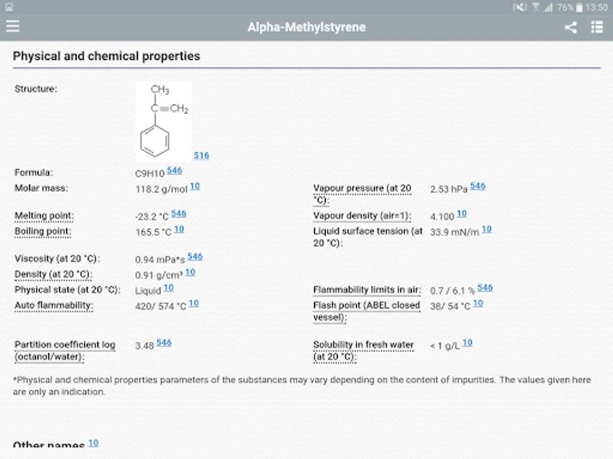 These are datasheets of chemical substances developed by EMSA (European Maritime Safety Agency) that contain relevant information for responding to marine spill of hazardous and noxious substances (HNS). The MAR-CIS datasheets provide concise information on the substances' physical and chemical properties, handling and emergency spill response procedures, as well as maritime transport requirements for safe transport at sea. They collect different types of information on individual chemical substances:
