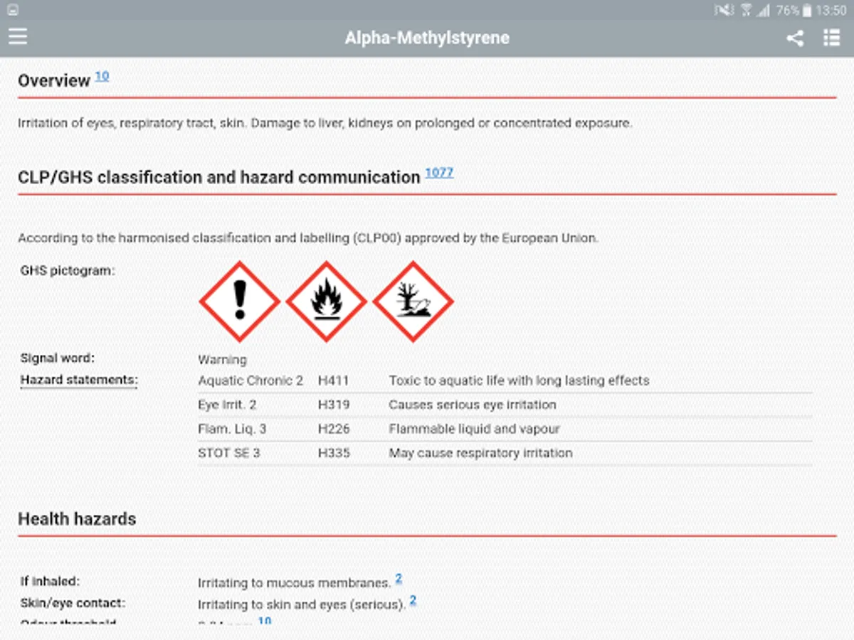 −Hazards and risks: classification and labelling, health and environmental hazards and substance intrinsic hazards;