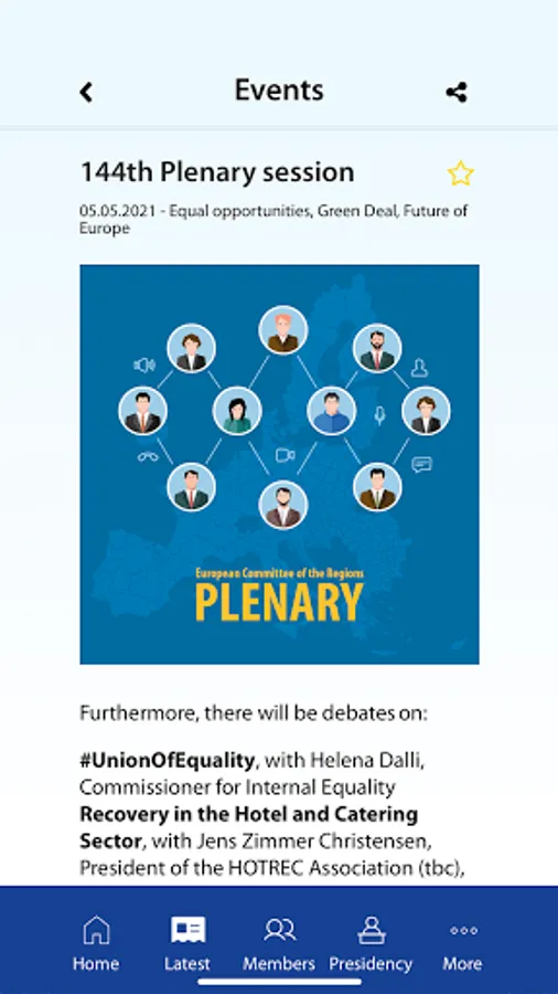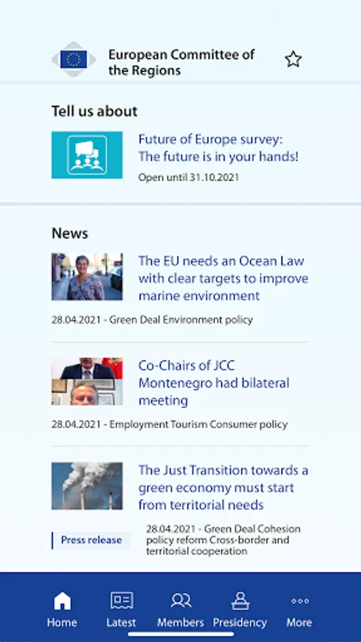 The mobile app of the European Committee of the Regions (CoR) brings you real-time notifications about news, events and opinions on your preferred topics. Save your favourite items and share contents as you go from meeting to meeting via social media and other channels.