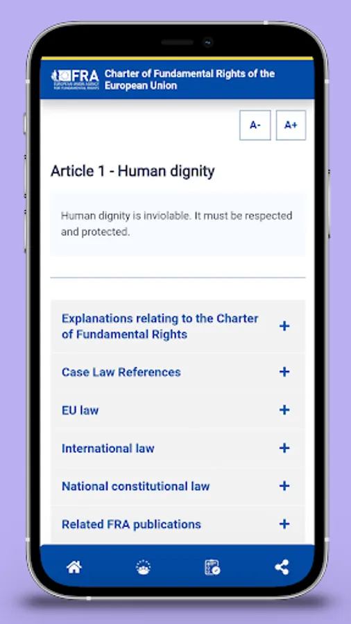 It offers easy access to the text of the Charter of Fundamental Rights of the EU in all official languages in a mobile-friendly format. It also provides regularly updated information on an article-by-article basis on related EU, and international law, European Court of Justice (ECJ) and a selection of European Court of Human Rights (ECtHR) and national case law that refers directly to one of the Charter articles. It also contains a list of related FRA publications.