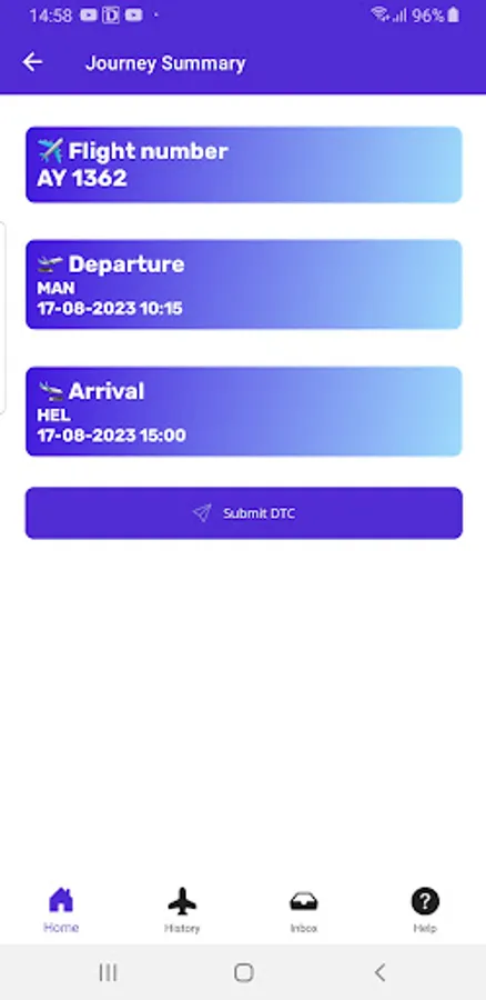 3. Lähetä tiedot sovelluksesta Rajavartiolaitokselle 36-4 tuntia ennen lentoasi. Käytä DTC:tä rajtarkastuksessa Helsinki-Vantaan lentoasemalla. Ota passisi mukaan matkalle.