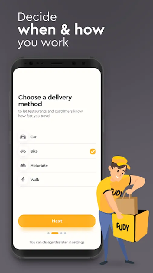 By becoming a Fudy Courier, you’ll earn money on your terms by delivering food by car, bike, or scooter. Pick when you work and deliver food from 100’s of local restaurants and cafés to delighted customers around town.