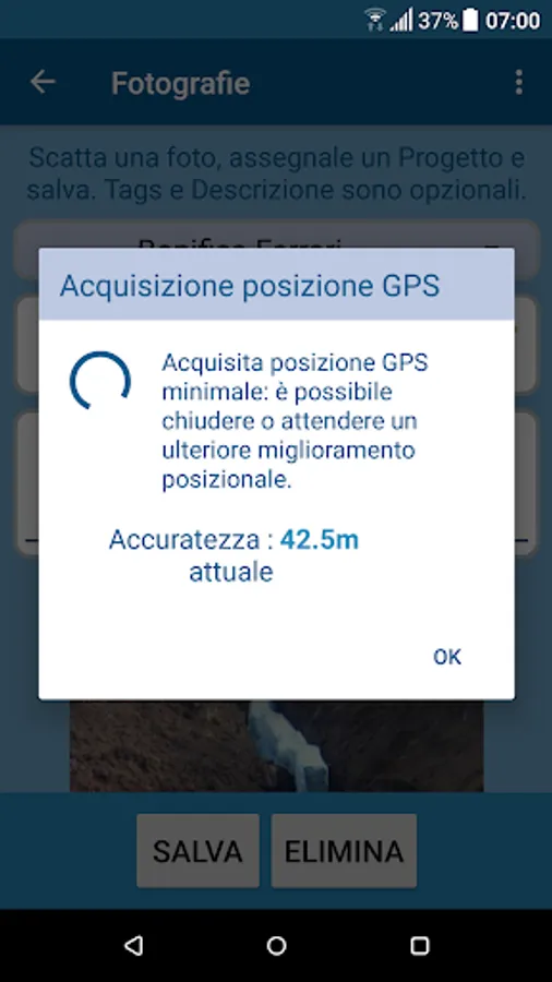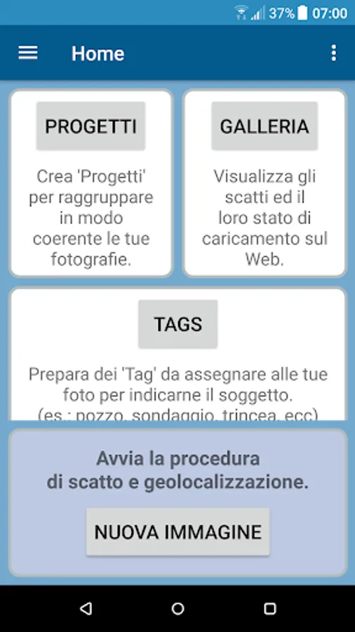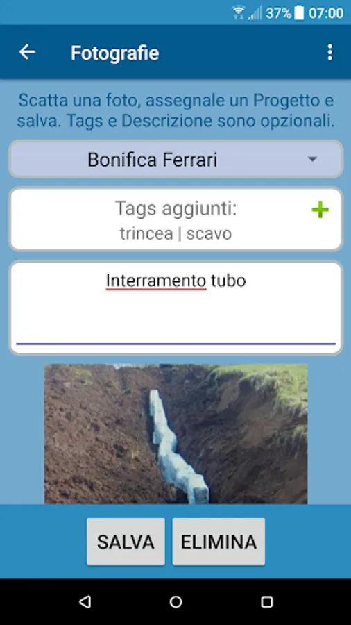 Take your photo with your phone, associate it with a Project, add keywords from your list of TAGS so that you can then find it more easily and, finally, save it.
