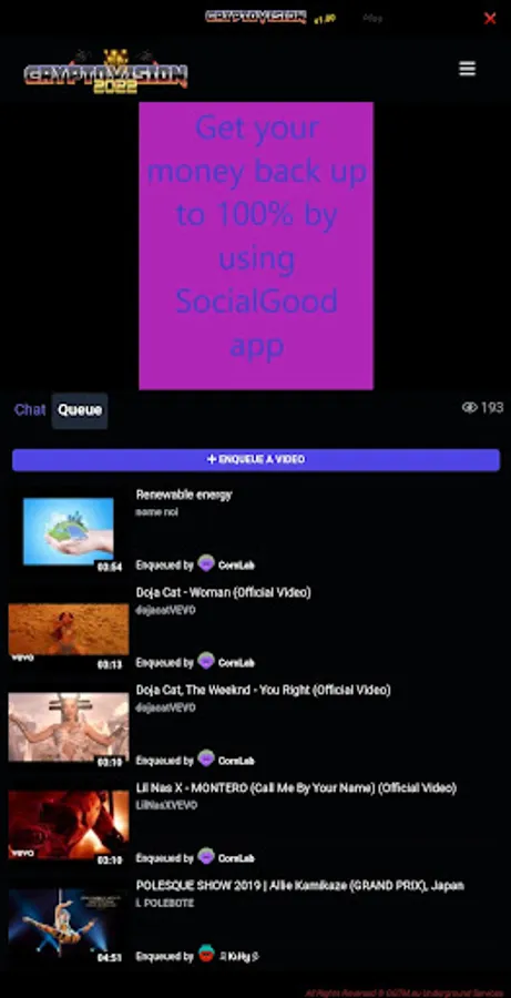 Queue: Show everyone what you like to watch and/or listen to by adding to the ever-evolving site playlist. Videos can be up to 35 minutes in length and will cost varying - but never supremely expensive - amounts. Want to hear your video next? Pay a little more. Don’t like the video that’s playing? Pay to skip. Want to force everyone to watch your most favourite video? Pay more to make your video unskippable.