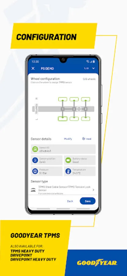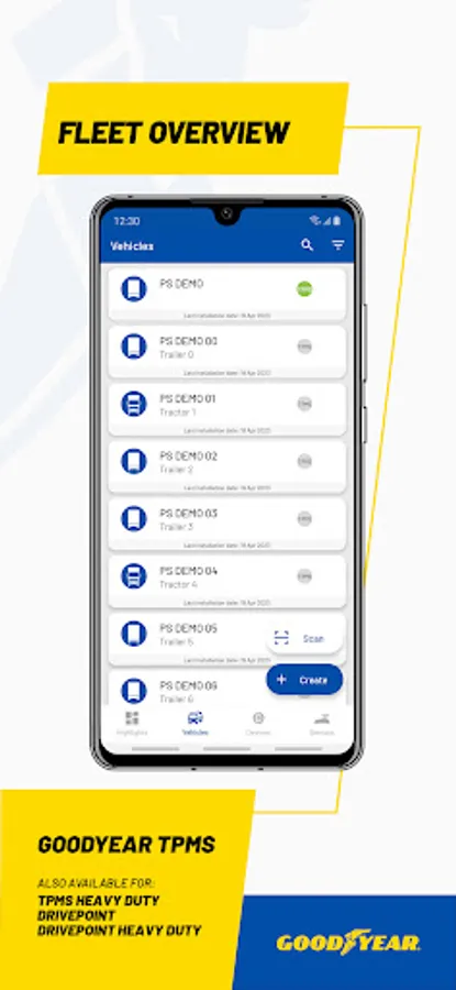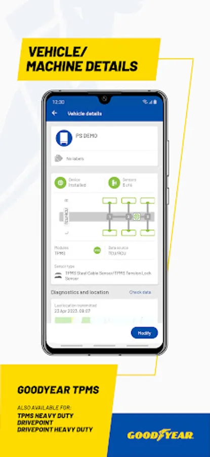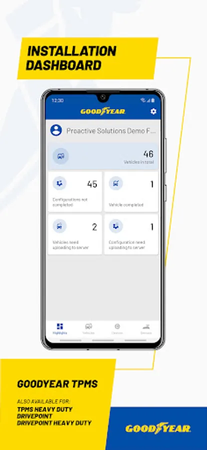 Goodyear TechHub supports the following solutions: Goodyear TPMS, Goodyear TPMS Heavy Duty, Goodyear DrivePoint and Goodyear DrivePoint Heavy Duty. Please note that a contractual subscription to one of these solutions is mandatory to access the mobile application. Additional hardware may be required for full functionality of the application.