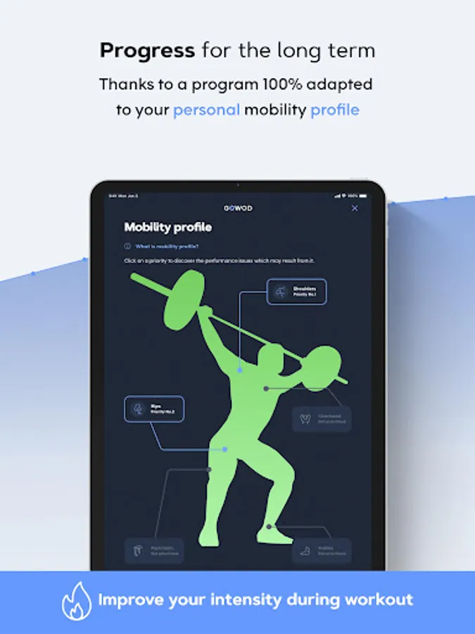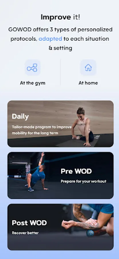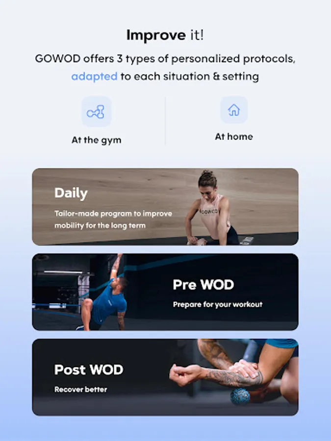 Created by CrossFit® practitioners and health professionals, and already used by more than 1,000,000 people including the best CrossFit® athletes on the planet, GOWOD is the only program designed to improve your flexibility and mobility in a totally personalized way!