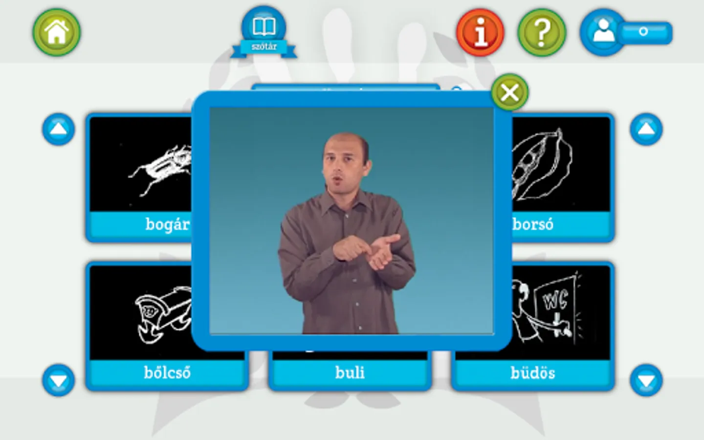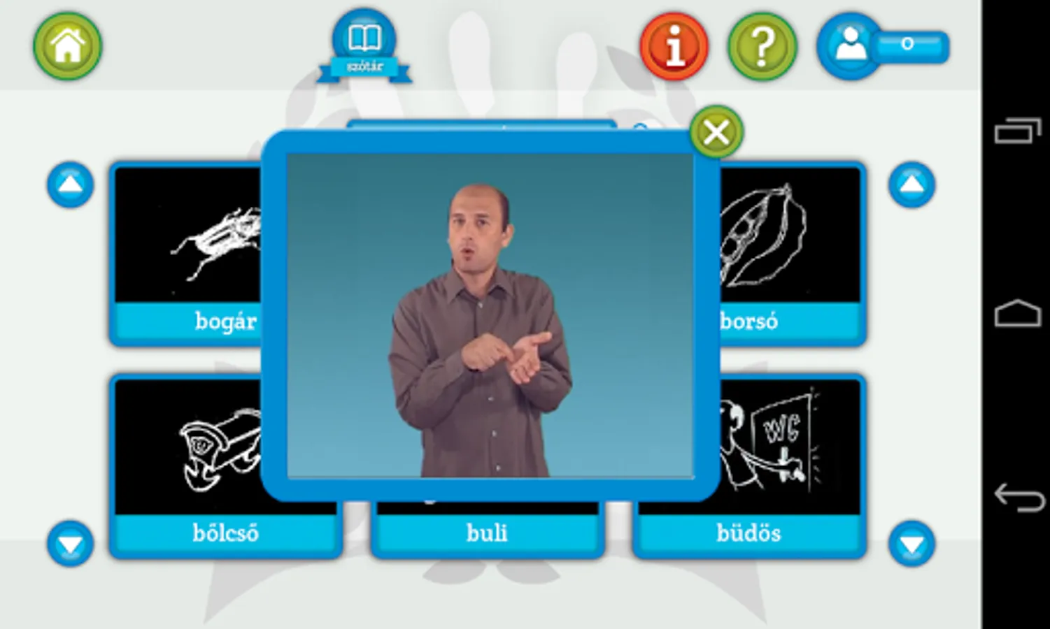 The application on the Hungarian Sign Language are the most common words in 300, so walking around topics such as family, clothing, weather, food, and the animal world. In addition, of course, the concepts of time and the numbers are a part of your treasures presented. All words, only one signal variation is shown as the younger children still face difficulties, can be confusing to many "good solution", the parallelism of multiple versions. In these cases, we tried to apply your version, based on the Hungarian-sounding voice that is easier to understand and remember. In the future, more times then expanded the application reference set of additional topics are often used treasures.