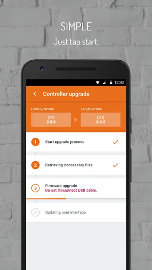 The firmware upgrade process is done in a couple of minutes and apart from a installer having to scan the controller’s serial number and connecting the controller and mobile device with a USB cable, the app takes care of the whole process.