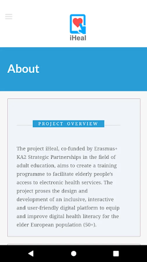 The project iHeal, co-funded by Erasmus+ KA2 Strategic Partnerships in the field of adult education, aims to create a training programme to facilitate elderly people’s access to electronic health services. The project proses the design and development of an inclusive, interactive and user-friendly digital platform to equip and improve digital health literacy for the elder European population (50+).