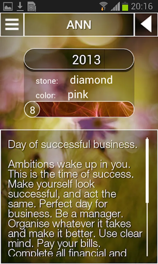 Following application's built-in calculator will suggest that your personal number may bring fortune, luck and prosperity for any day, any month and any year of your life. After calculating the number, you will find detailed interpretation and guidance that will be usefull for you while helping you to achieve success. Furthermore, to bring success throughout particular period you will be suggested what colour clothes you should wear and what jewel stone to carry.