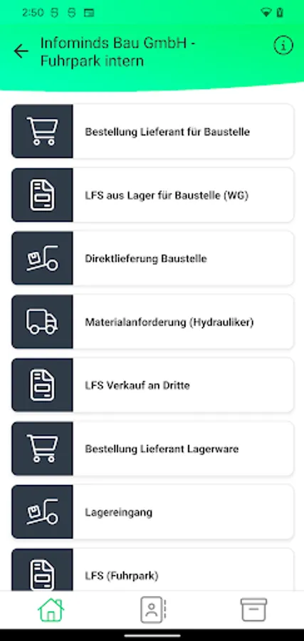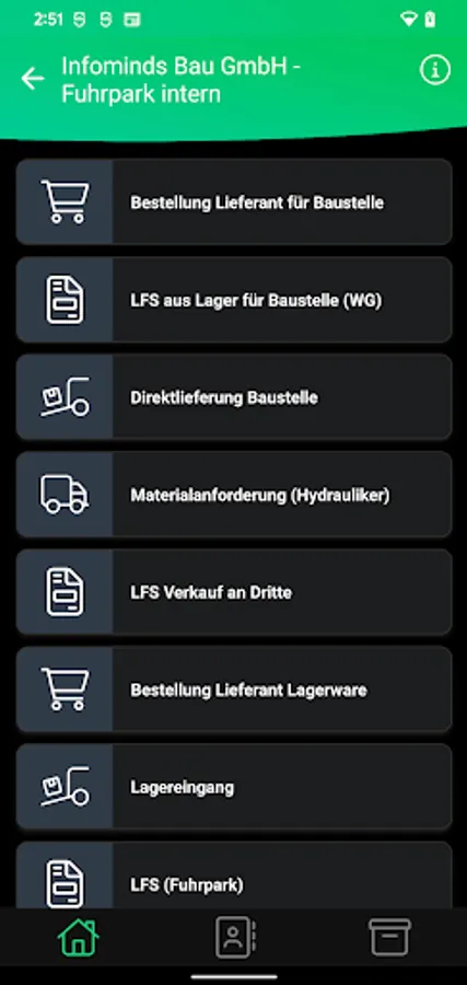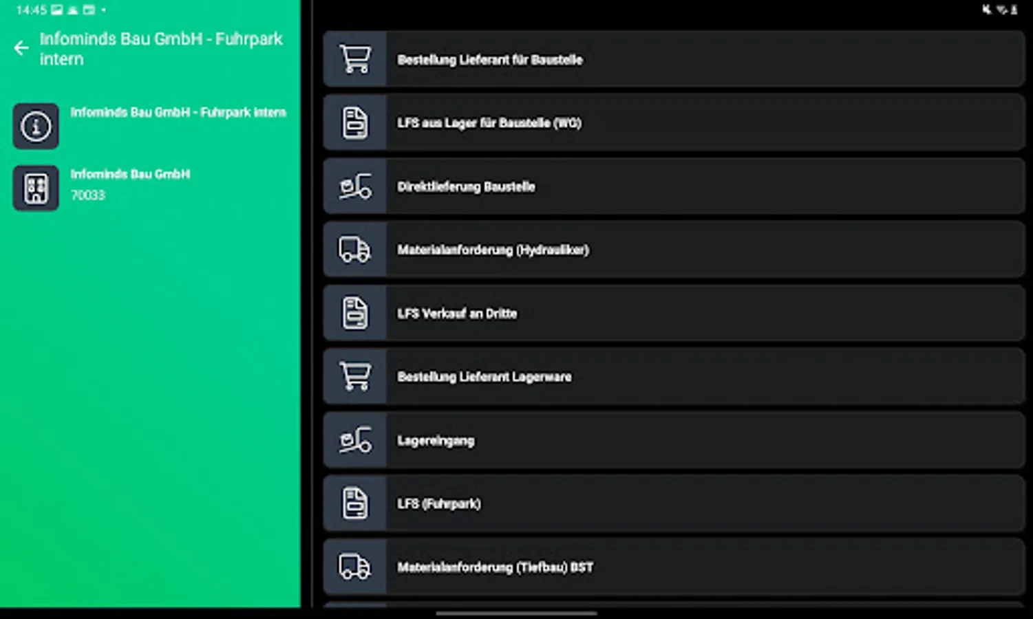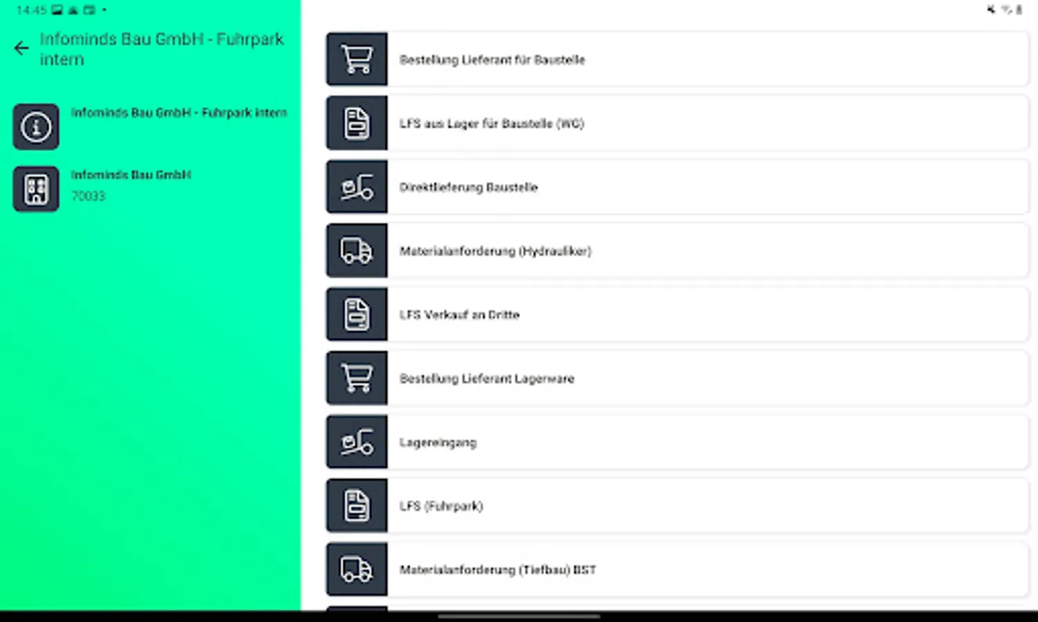 Not only effective services such as delivery notes or transfers can be created. There is also the option of entering material requirements or orders already placed with the supplier. It is possible to define which options are active for each user.