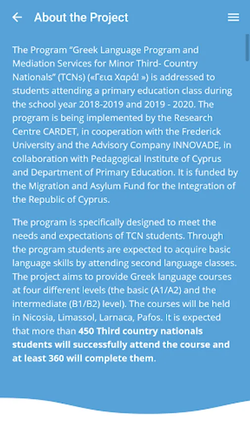 The Program "Greek Language Program and Mediation Services for Minor Third- Country Nationals" (TCNs) («Γεια Χαρά! ») is addressed to students attending a primary education class during the school year 2018-2019 and 2019 - 2020. The program is being implemented by the Research Centre CARDET, in cooperation with the Frederick University and the Advisory Company INNOVADE, in collaboration with Pedagogical Institute of Cyprus and Department of Primary Education. It is funded by the Migration and Asylum Fund for the Integration of the Republic of Cyprus. The program is specifically designed to meet the needs and expectations of TCN students. Through the program students are expected to acquire basic language skills by attending second language classes.