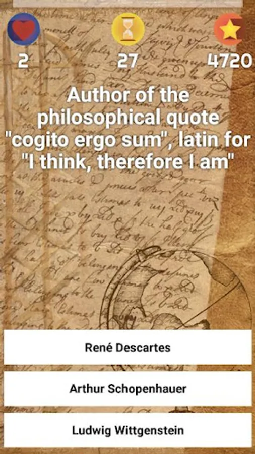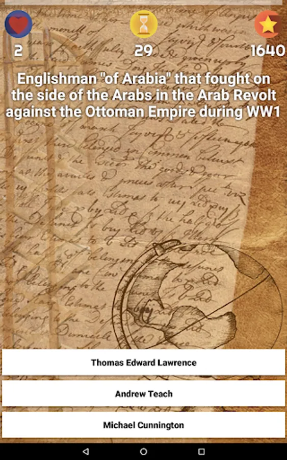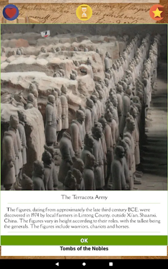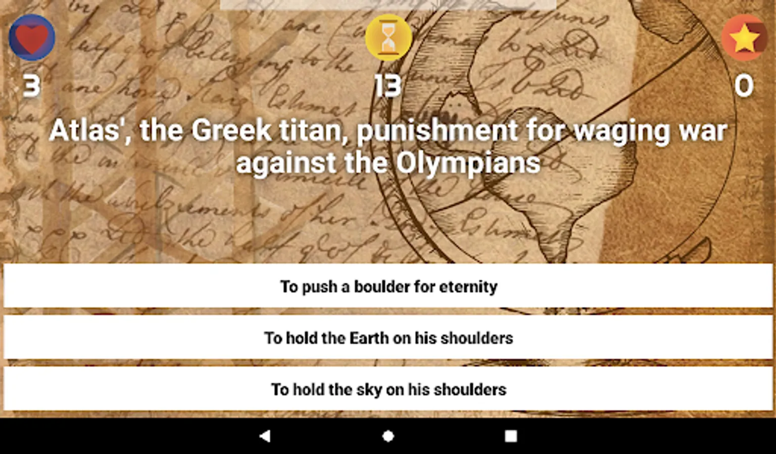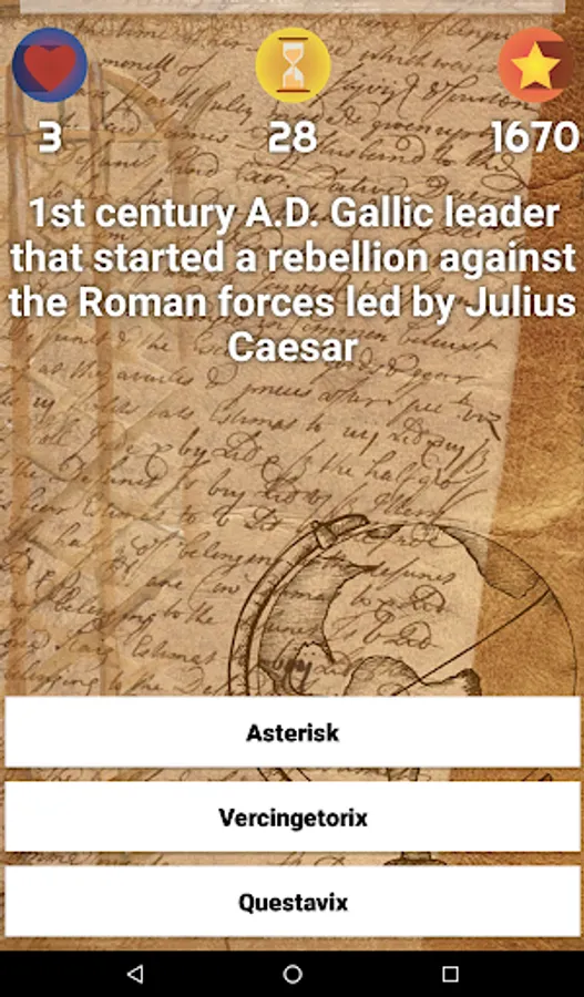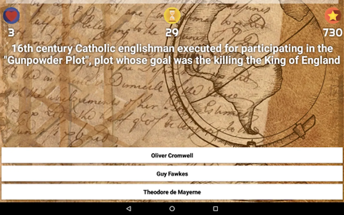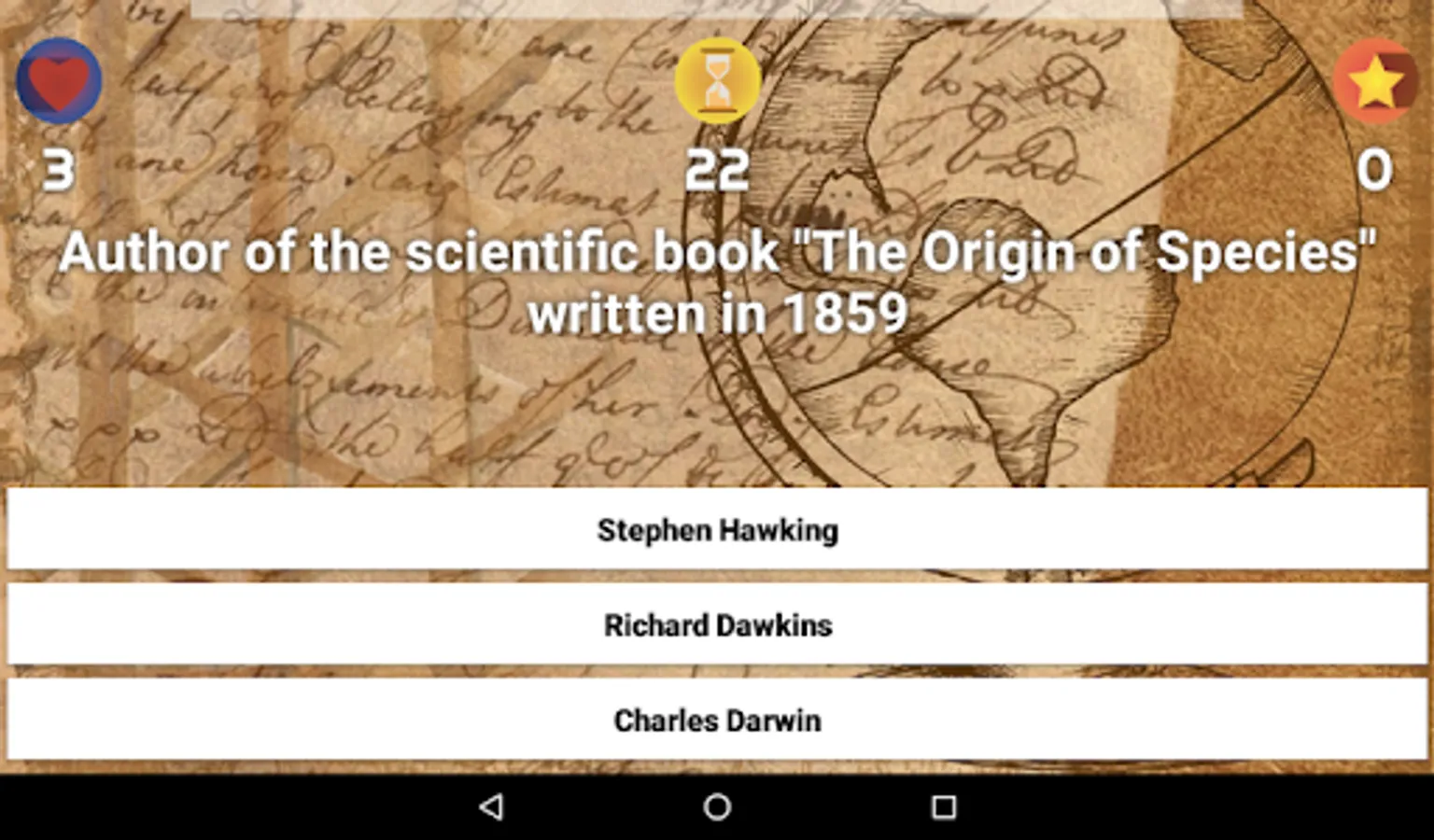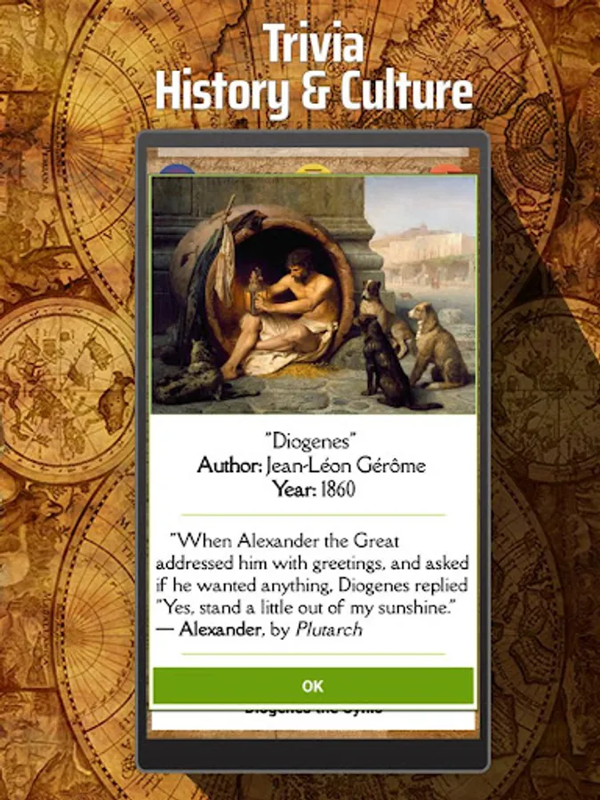 Challenge yourself to a trivia game about world history, culture and art. Plethora of subjects that'll tease your brain and may even help you discover more about our world. Quotes, illustrations and short descriptions also await.