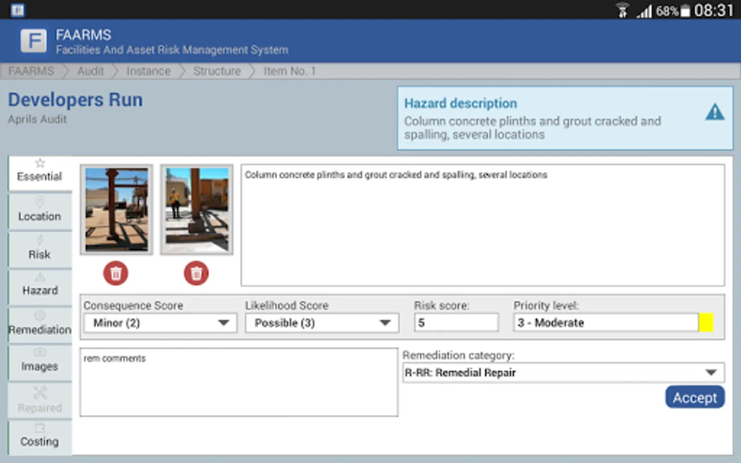 FACILITIES AND ASSETS RISK MANAGEMENT SYSTEM (FAARMS) is an objective asset auditing methodology supported by a database tool that records the complete history of an asset condition and associated risks through multiple audits.