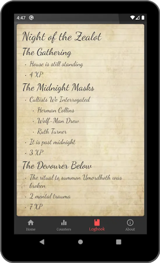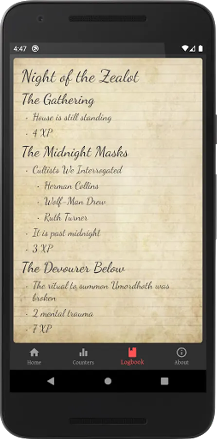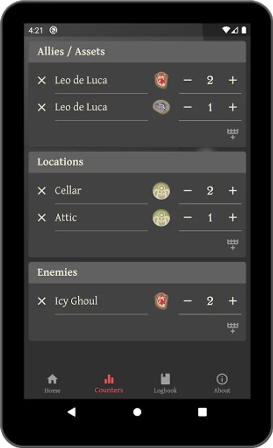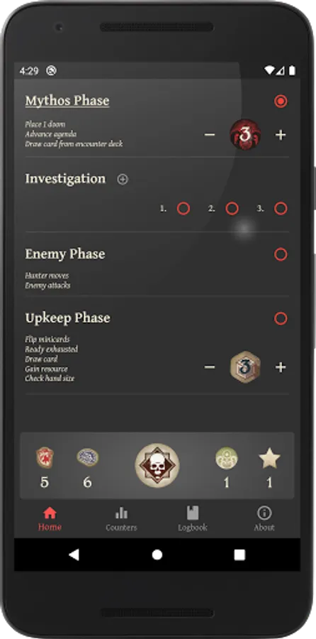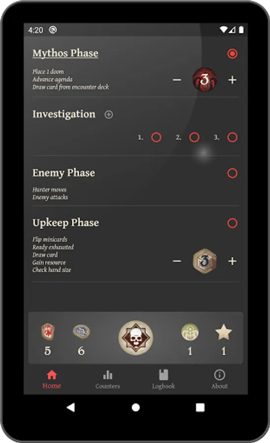 The app helps you to keep the progress of your Arkham Horror LCG campaign or a single game. Useful especially when you want to take just cards and play without tokens, chaos bag, log book, etc.