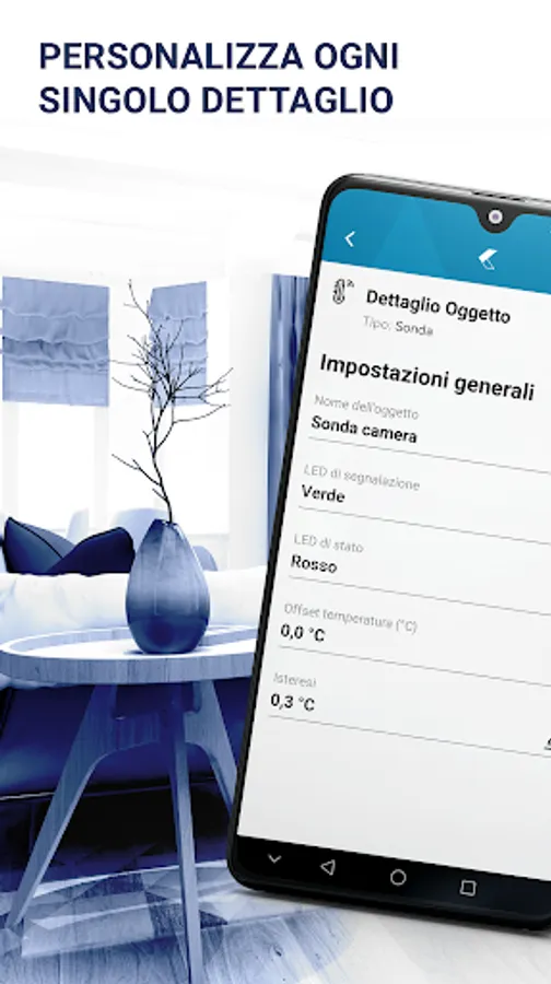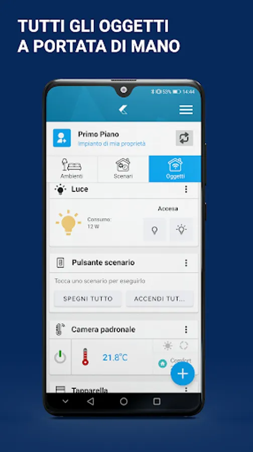 Find all the devices of your home automation system in a single tab: on/off and dimmable lights, shutters, automations, thermostats and scenarios. You can choose to manage them individually from the "Objects" screen or group them into customized "Rooms".