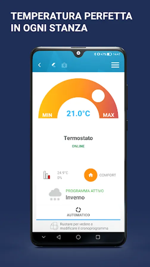 Manage the temperature in three different modes: manual, temporary manual or automatic. Rotate the smartphone to configure the schedule with six different customizable temperature ranges: comfort +, comfort, night, economy, economy +, stop/antifreeze.