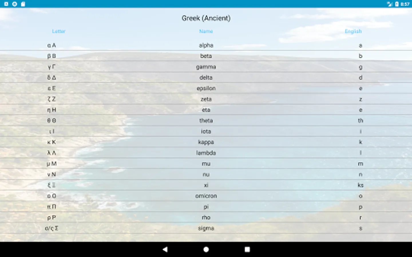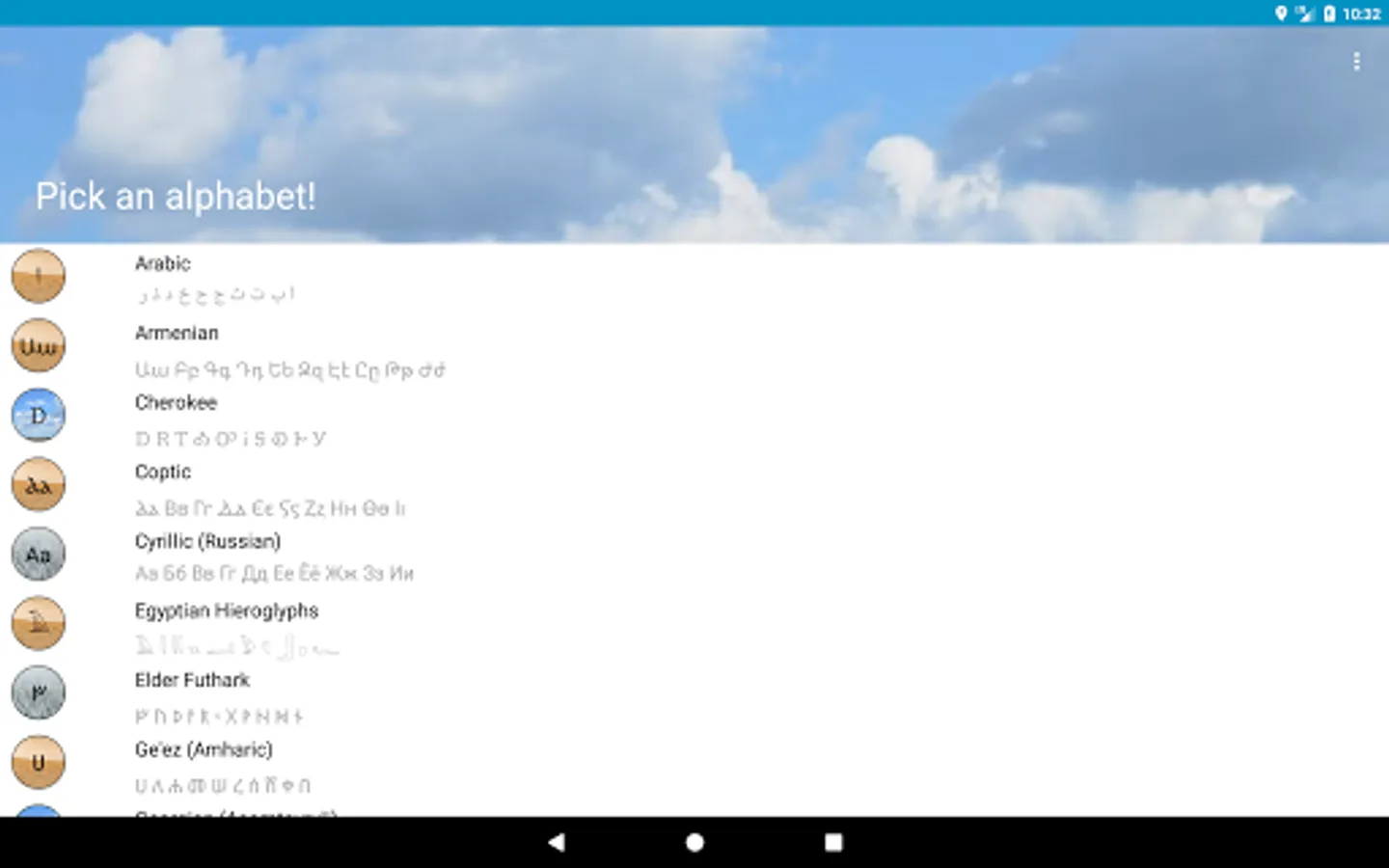 With Alphabets you will learn how to read 53 alphabets: American Sign Language, Anatolian Hieroglyphs, Arabic, Armenian, Aurebesh, Baybayin, Braille, Cherokee, Coptic, Cuneiform, Cyrillic, Devanagari, Egyptian Hieroglyphs, Elder Futhark, Futhorc, Ge'ez, Georgian (Asomtavruli), Georgian (Mkhedruli), Georgian (Nuskhuri), Glagolitic, Gothic, Greek (Ancient), Greek (Modern), Hebrew, Hiragana, Inuktitut, Katakana, Khmer, Klingon, Korean (Hangul), Latin, Linear B, Lontara, Lycian, Lydian, Malayalam, Maya, Mongolian, Morse, N'Ko, Neo-Tifinagh, Ogham, Old Italic, Old Turkic (Orkhon), Phoenician, Semaphore, Syriac, Telugu, Tengwar, Thaana, Thai, Tibetan and Younger Futhark.