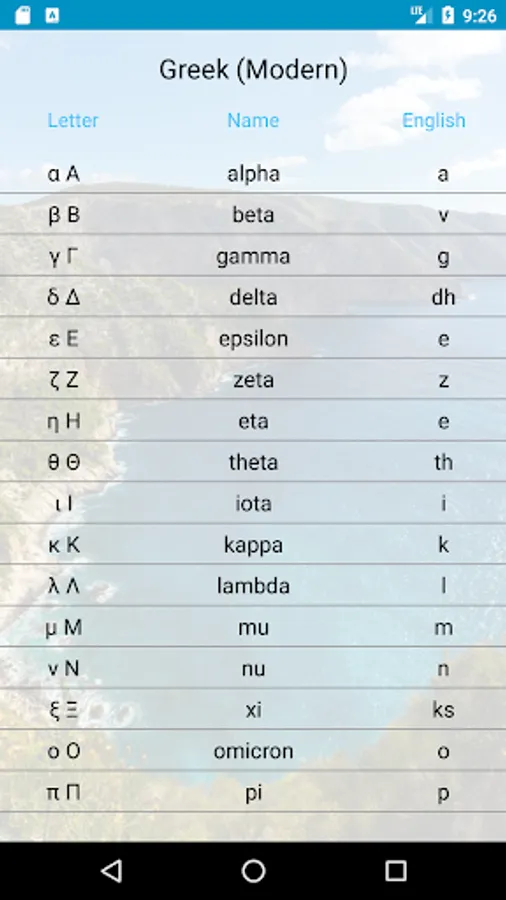 Learn with flashcards to memorize all the letters of an alphabet. Each flashcard contains the symbol of the letter, both typed and handwritten, its English name, its original name and how to pronounce the sound of the letter.