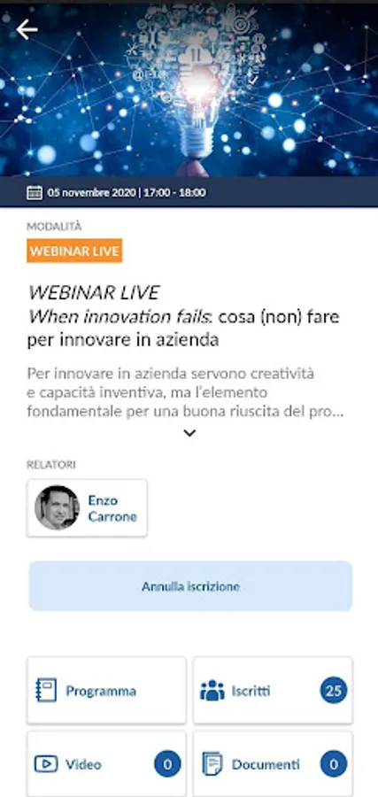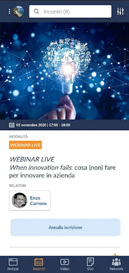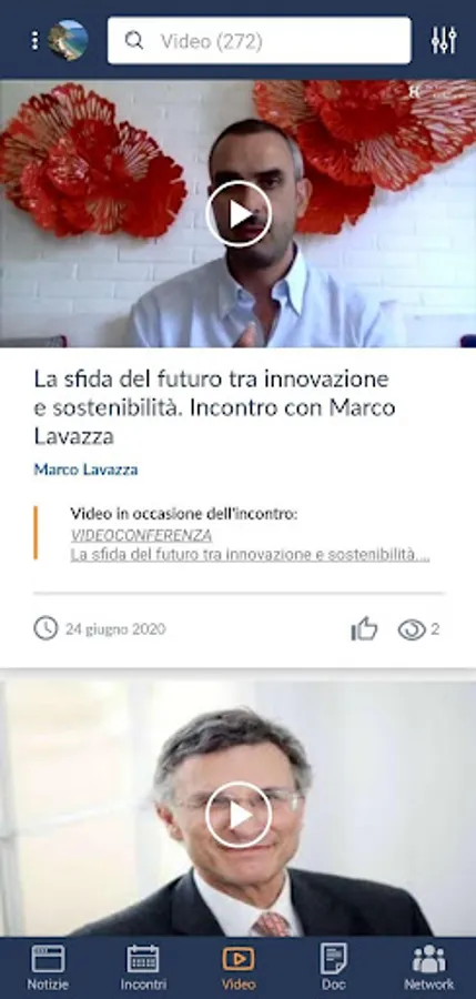 From the main menu, you can view the list of upcoming meetings, register, request the information kit, find out about the details of the session and the speakers, view the map of the event location. It is also possible to review the videos and download the in-depth readings recommended for each topic. Under "My network" you can scroll through the basic information of all other members of the service, with references to the company and the position held and with the list of common participations in the meetings. A search engine integrated into the APP allows you to search for contents by filtering them by thematic areas or geographical areas.