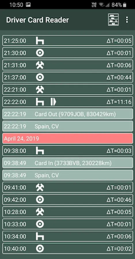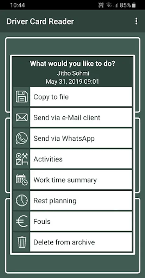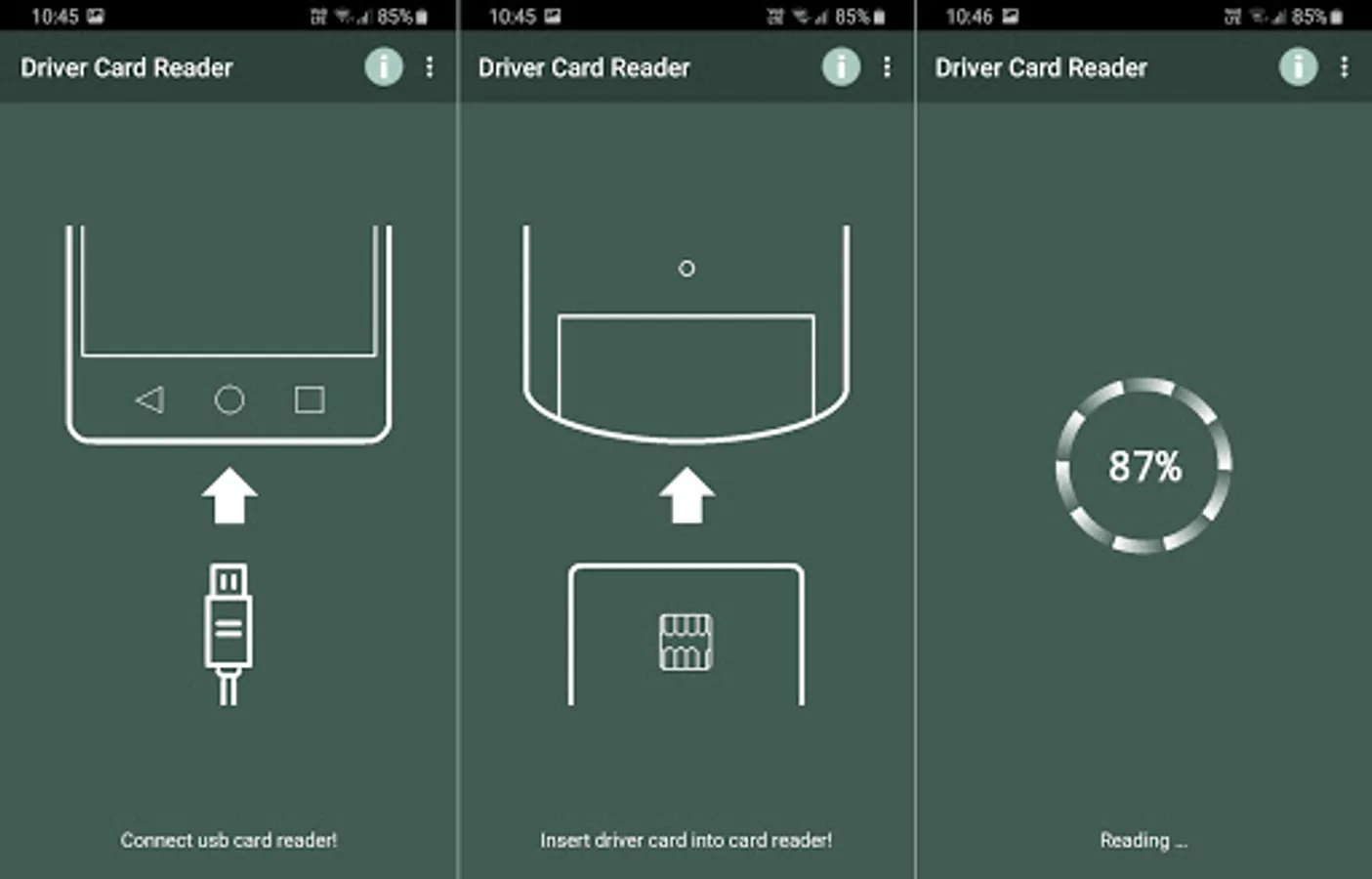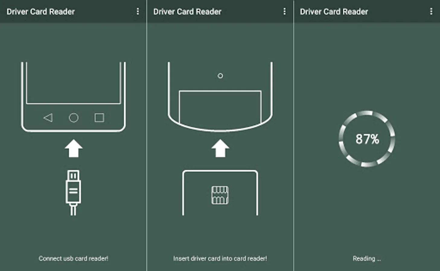 With this application you can read (download) digital tachograph driver card. You can share data in different ways or store it on your device in different formats (ddd, esm, tgd, c1b). The read time will be written back to the card and the application reminds you of the 28-day read obligations