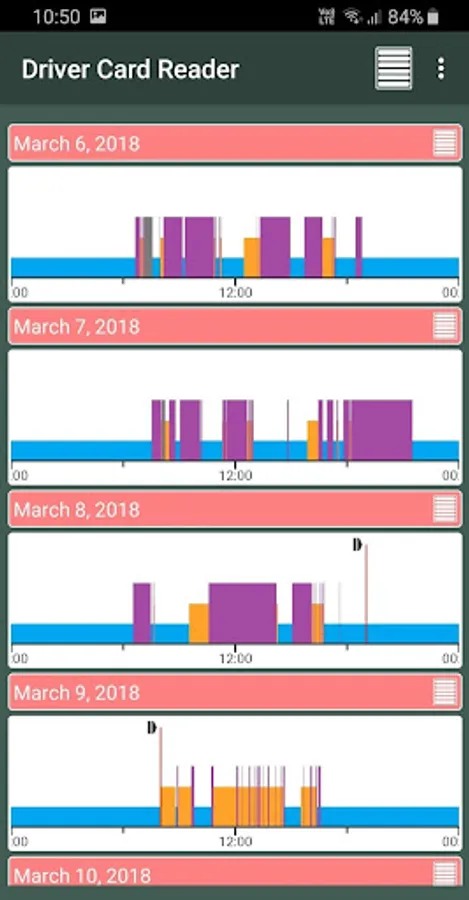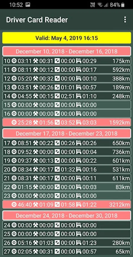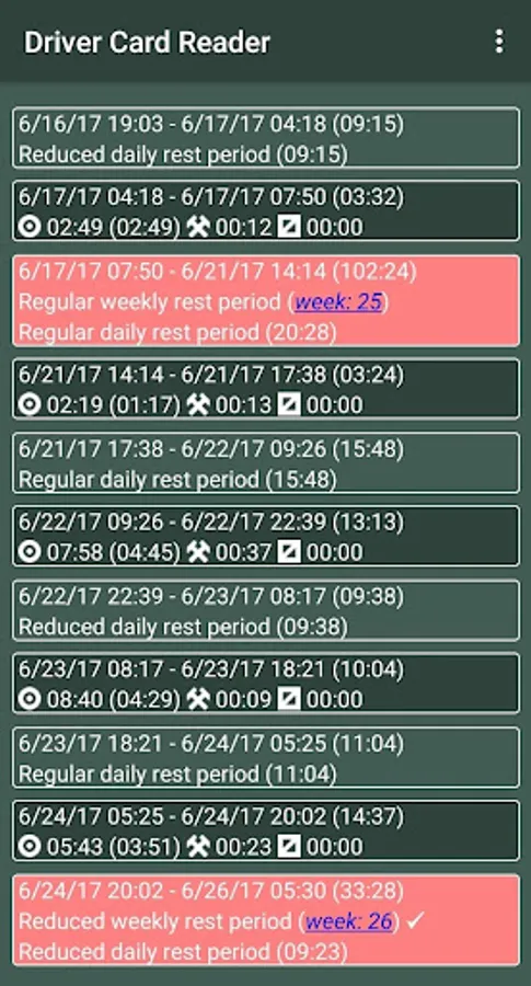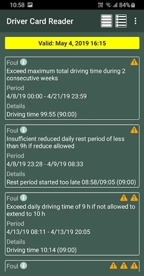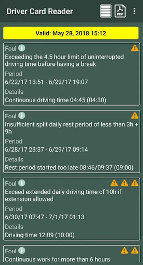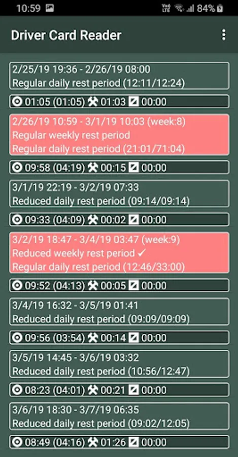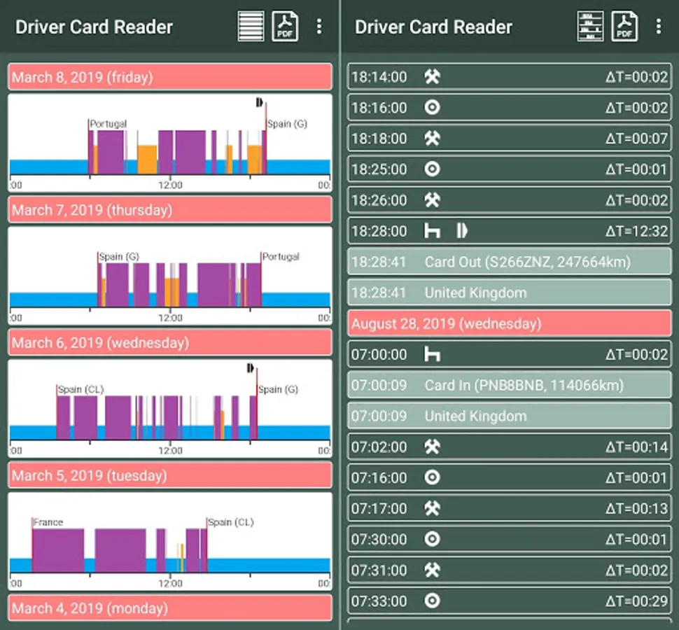 The application analyzes the data on the driver card and shows you the irregularities in driving and rest periods. You can see a detailed list of driver activities. You can get a work time summary report (shift/week/month). We can help you plan your working/rest time.
