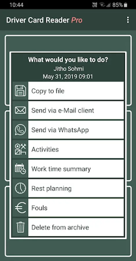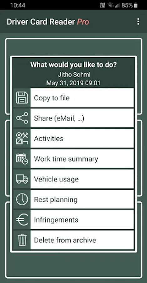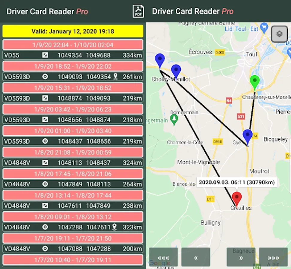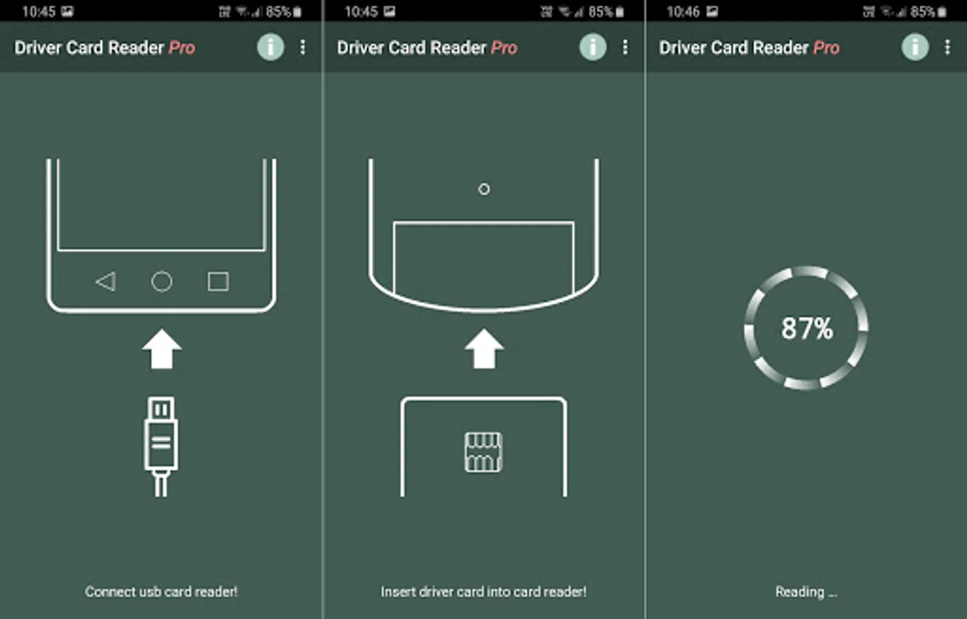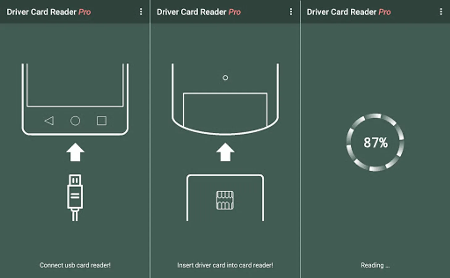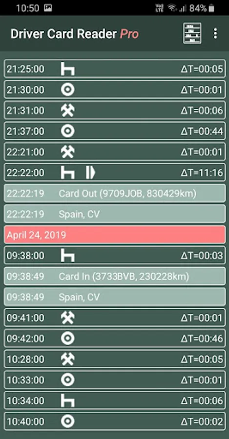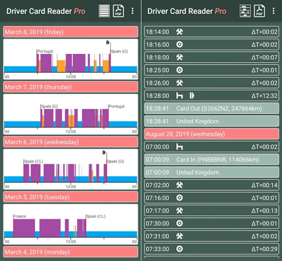 This app is designed for professional truck drivers. With this application you can read the digital tachograph driver card. You can share data in different ways or store it on your device in different standard formats (ddd, esm, tgd, c1b). The read time will be written back to the card and the application reminds you of the 28-day read obligations.