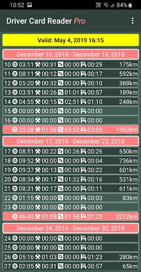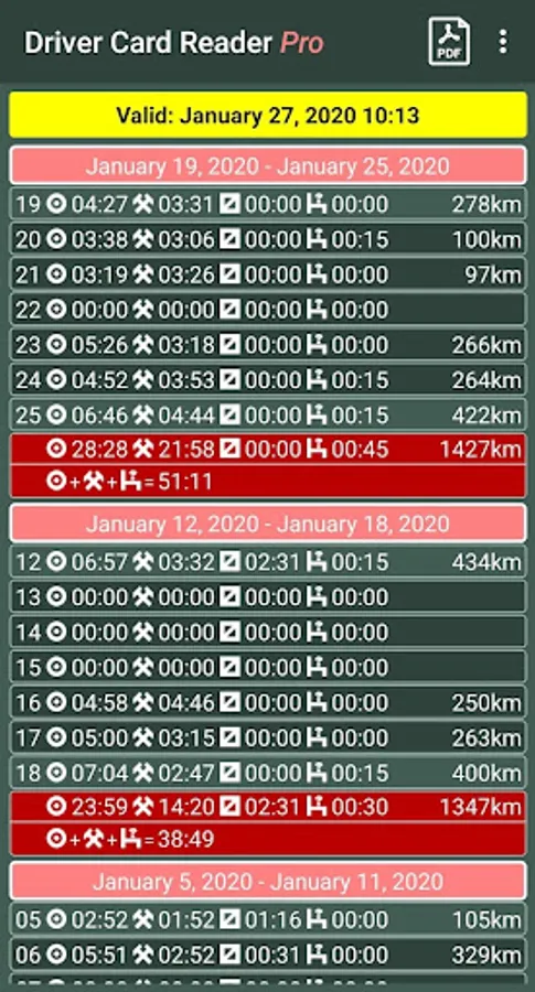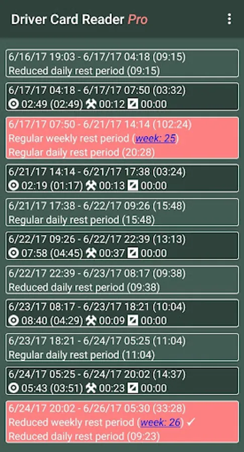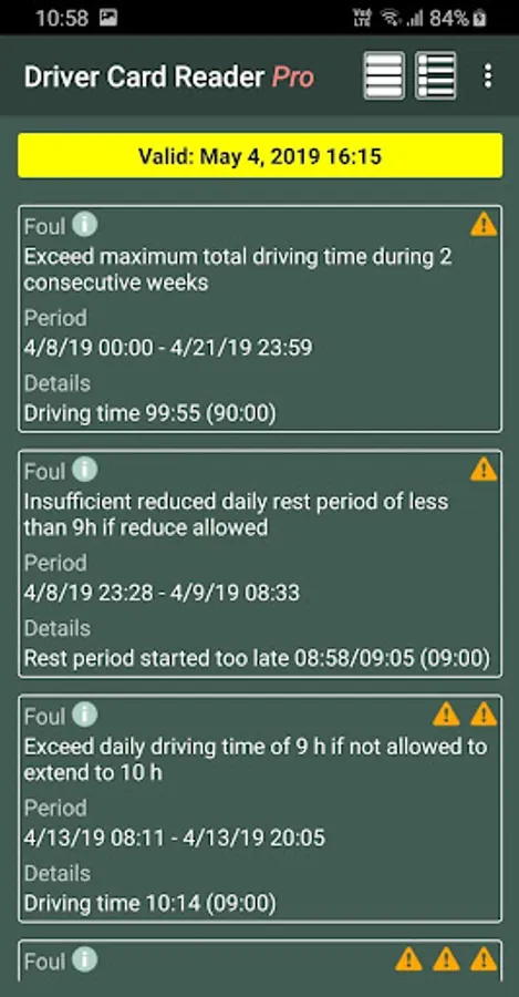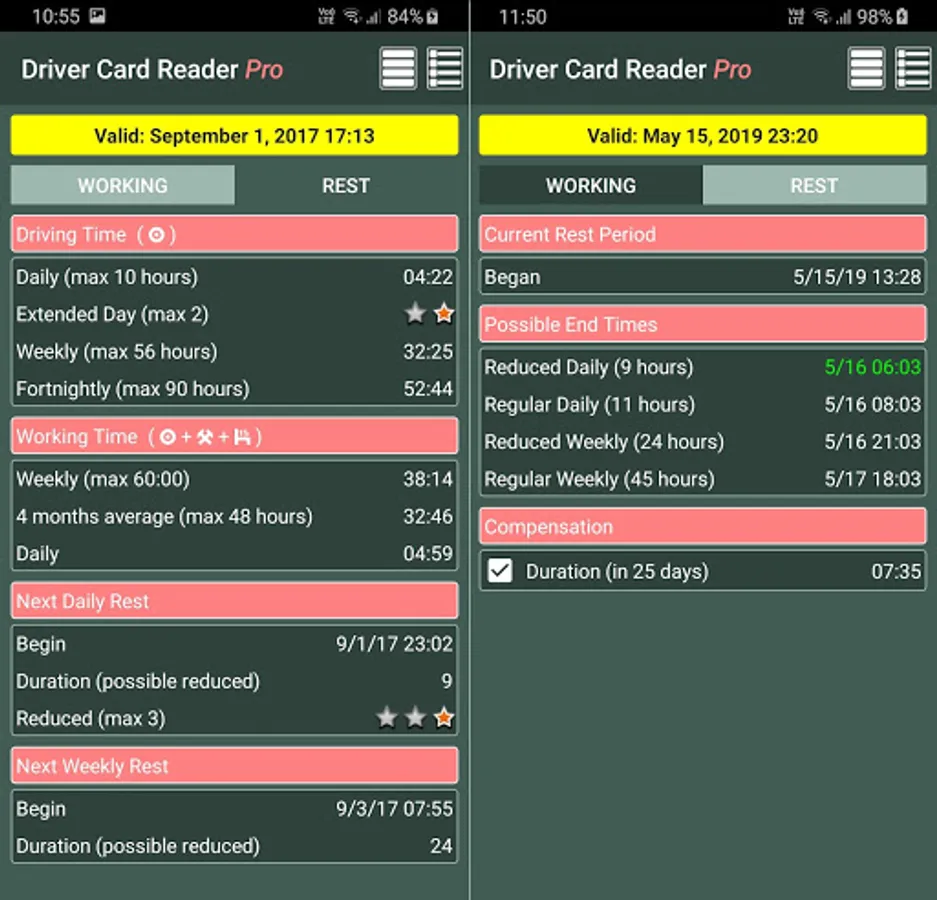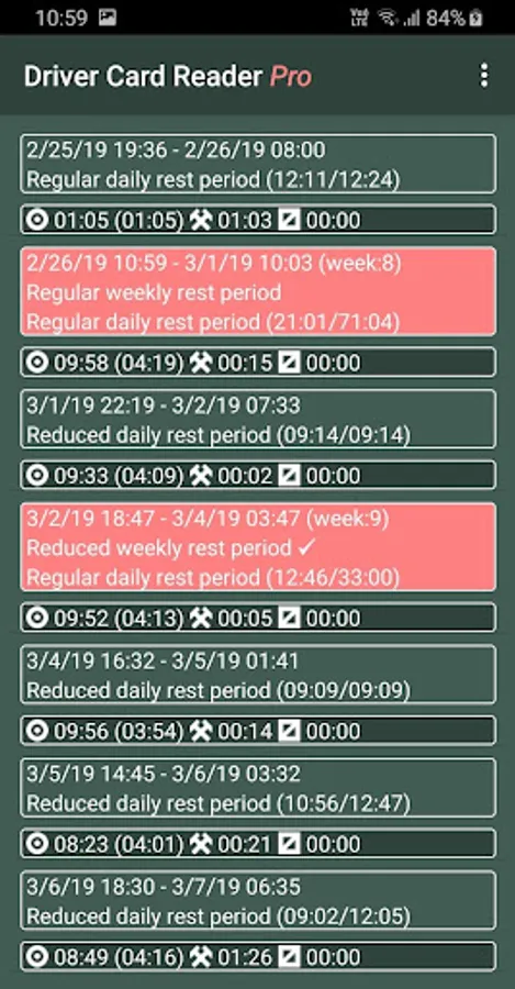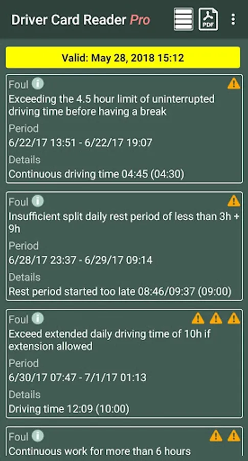 The application analyzes the data on the driver card and shows you the infringements in driving and rest periods. You can get a detailed list of driver activities and a shift / weekly / monthly work summary. We can help you plan your working/rest time.
