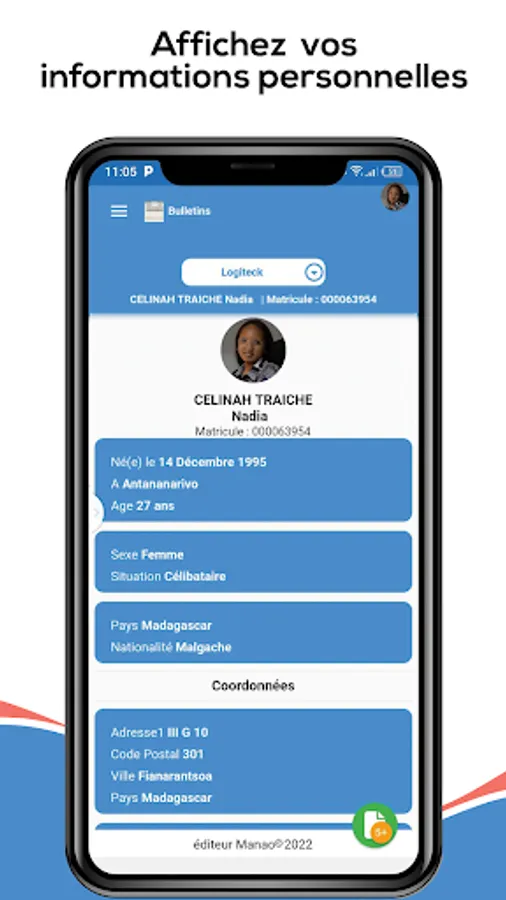 It allows employees of a Malagasy company to view their personal information and download their payslips quickly and intuitively.