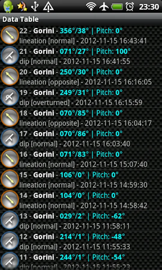Allows the measure of both Dips (Dip-Azimuth and Dip-Angle) and Lineations of any surface/linear element without having to level the compass. Just lie down the phone on the plane or align its long side with the elongated element and click "Save".