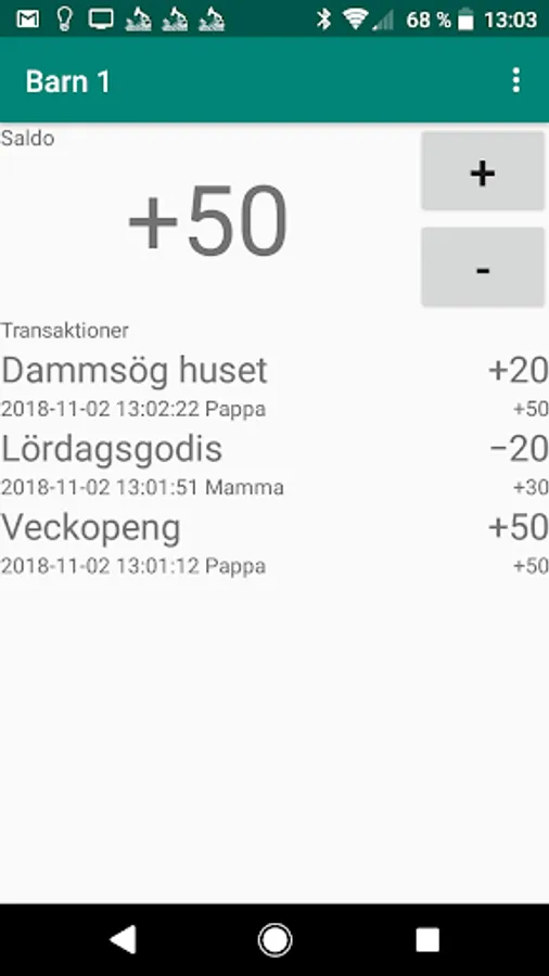 Parents add transactions to your children. Examples: weekly/monthly money, when they spend money and you pay for them and when they perform tasks to earn money.