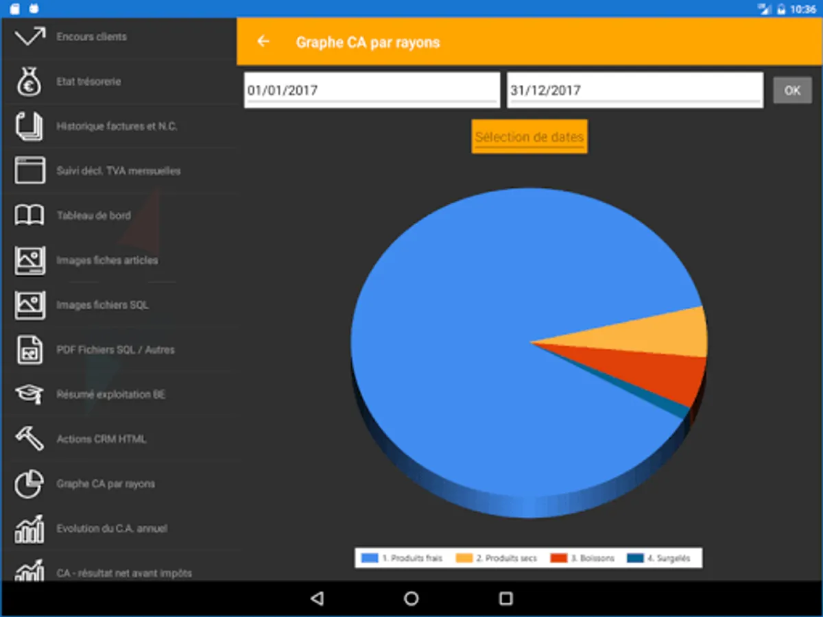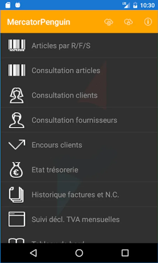 The application lets you search and view the available data in the ERP Mercator. Depending on user rights, several features are made available to him and allow him to extract a simple, fast and secure data it needs. The results are displayed as lists or graphs. This data access is done in real time via the data connection of the mobile device.