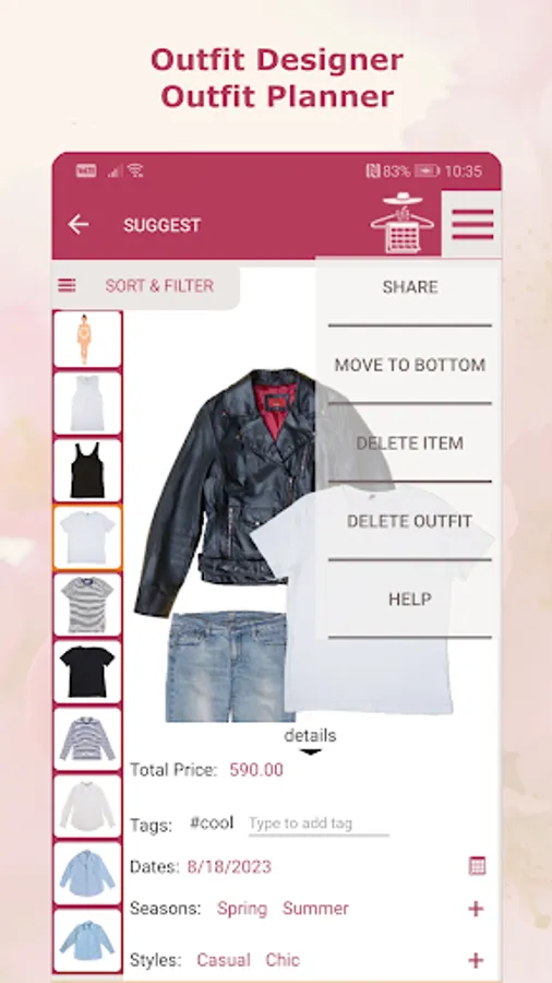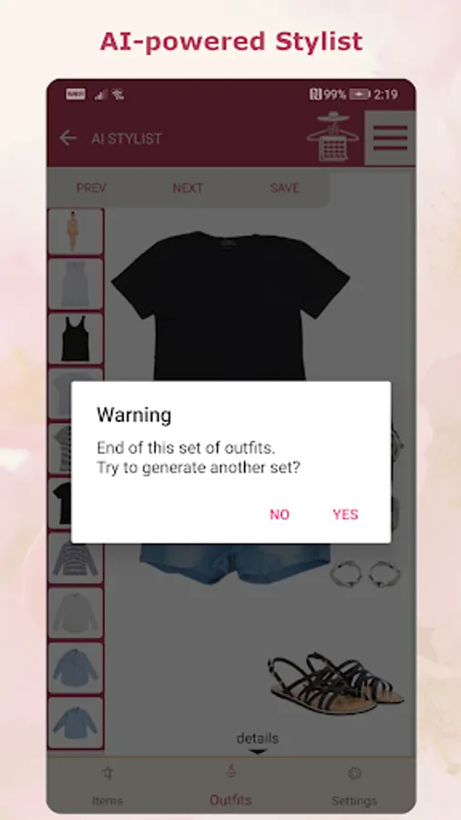 Outfits are created either manually or by the AI stylist. The AI stylist is specially designed to follow the principles of color combining or to choose from a variety of predefined color schemes. Suggested outfits consist of 1 to 4 pieces and are offered with a selection of accessories, if present. You can edit each AI-generated outfit to make it perfect for your taste.