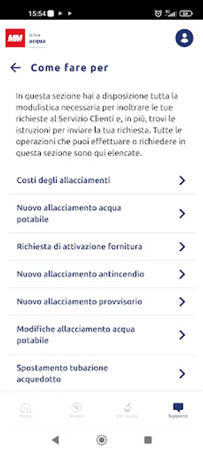 • SUPPORT: to find out how to send your requests to Customer Service, find answers to the most frequently asked questions about the service and contact channels with MM Spa, the manager of the Integrated Water Service of Milan (Emergency Response and Customer Service)