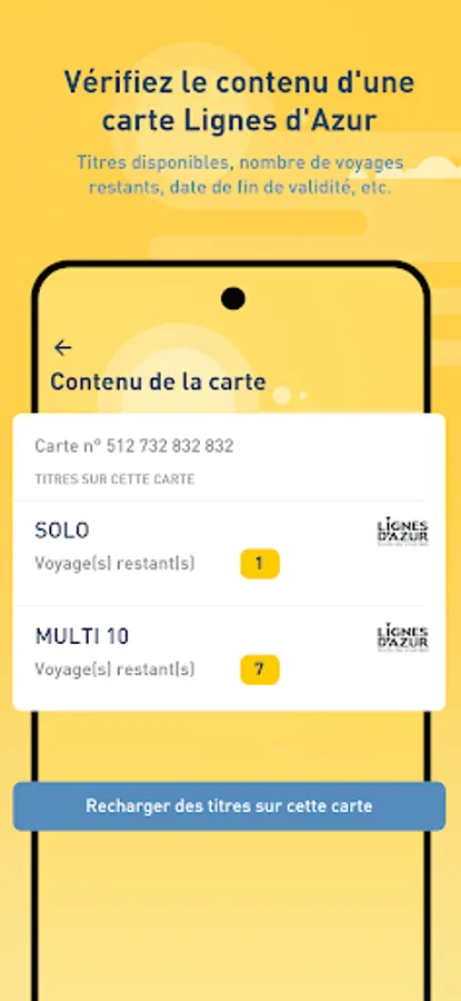The application also allows you to check the content of a Lignes d'Azur card: number of trips remaining, expiry date of a subscription, etc.