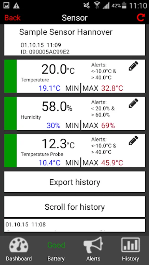 - The self-explanatory graphical user interface of the app is intuitive and can be customized to suit your needs. Insert for each wireless sensor its own name, and set up a specific alarm limits.