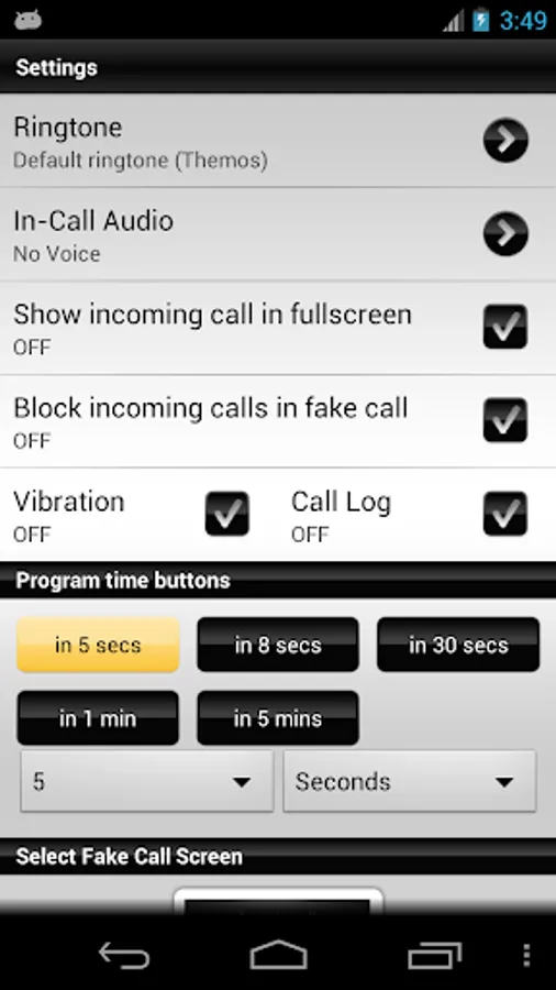 - Choose a custom fake call voice for the fake call. The fake call voice can also be turned OFF if desired.