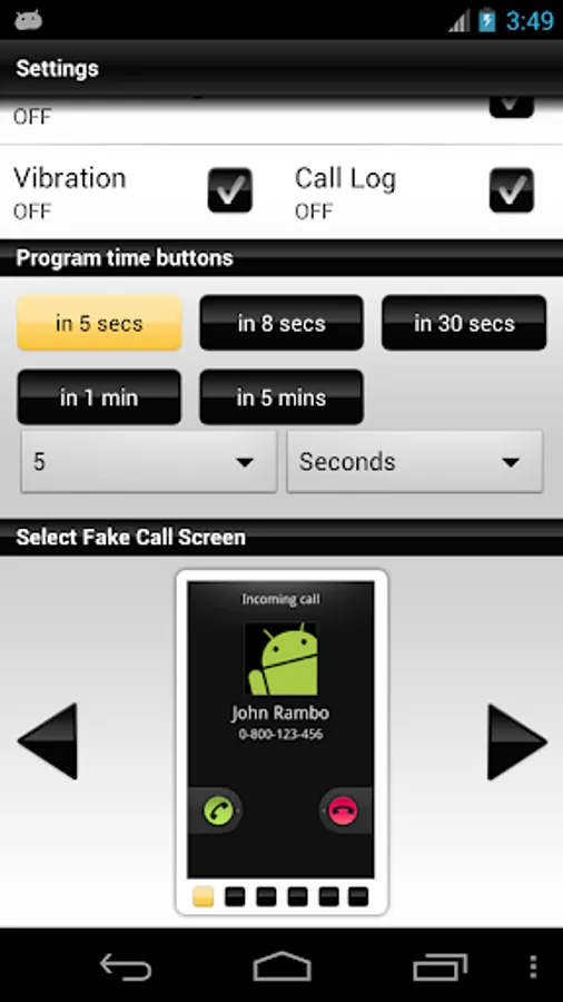 - Option to program the time interval buttons for faking a call with custom time intervals