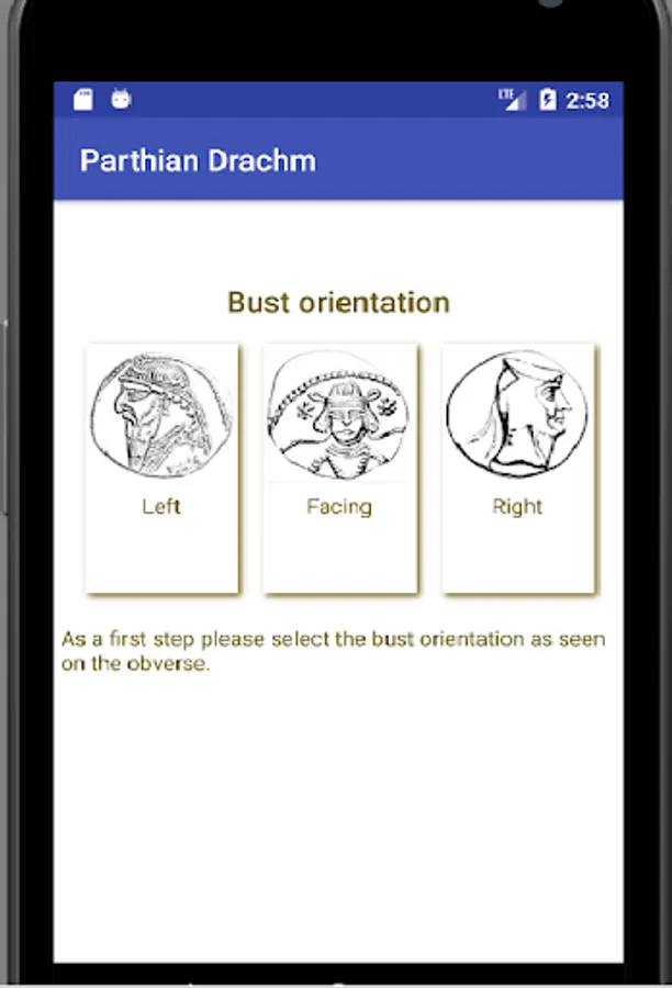 The Parthian coin identification is based on David Sellwood work 'An Introduction to The Coinage of Parthia' issued by Spink in 1980. That book is rarely found today. Earlier works also exist and still in use. However these works disagree radically how they attribute a coin to a ruler. This results in a lot of misunderstanding and misidentifying of coins. The aim of this identification application is to both help the experienced collectors to overcome the miss of Sellwood's book, and to give a straightforward classification method for the beginners.