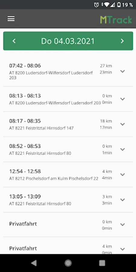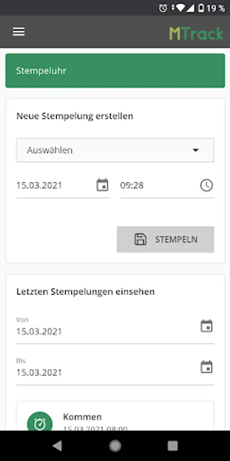 Employees have the option of manually entering working times that they did not use the vehicle for. This means that home office times or activities that are not automatically recorded in MTrack Time by the telematics can be entered in the driver app. Here you can determine whether the time can only be stamped currently using GPS comparison or whether it can also be edited individually by the employee afterwards. All manual entries are highlighted in color so that they are immediately visible in MTrack Time.