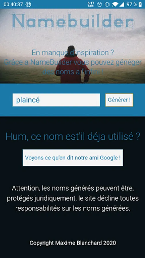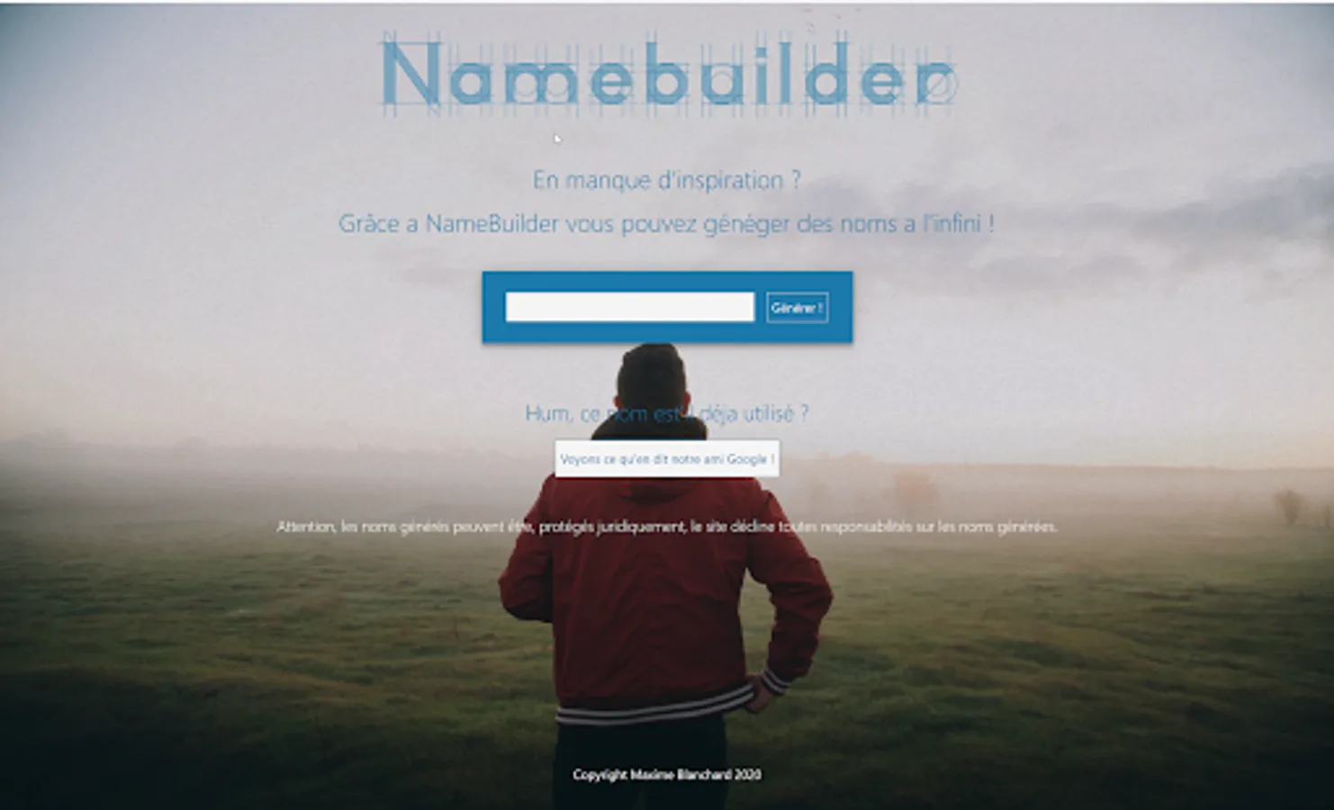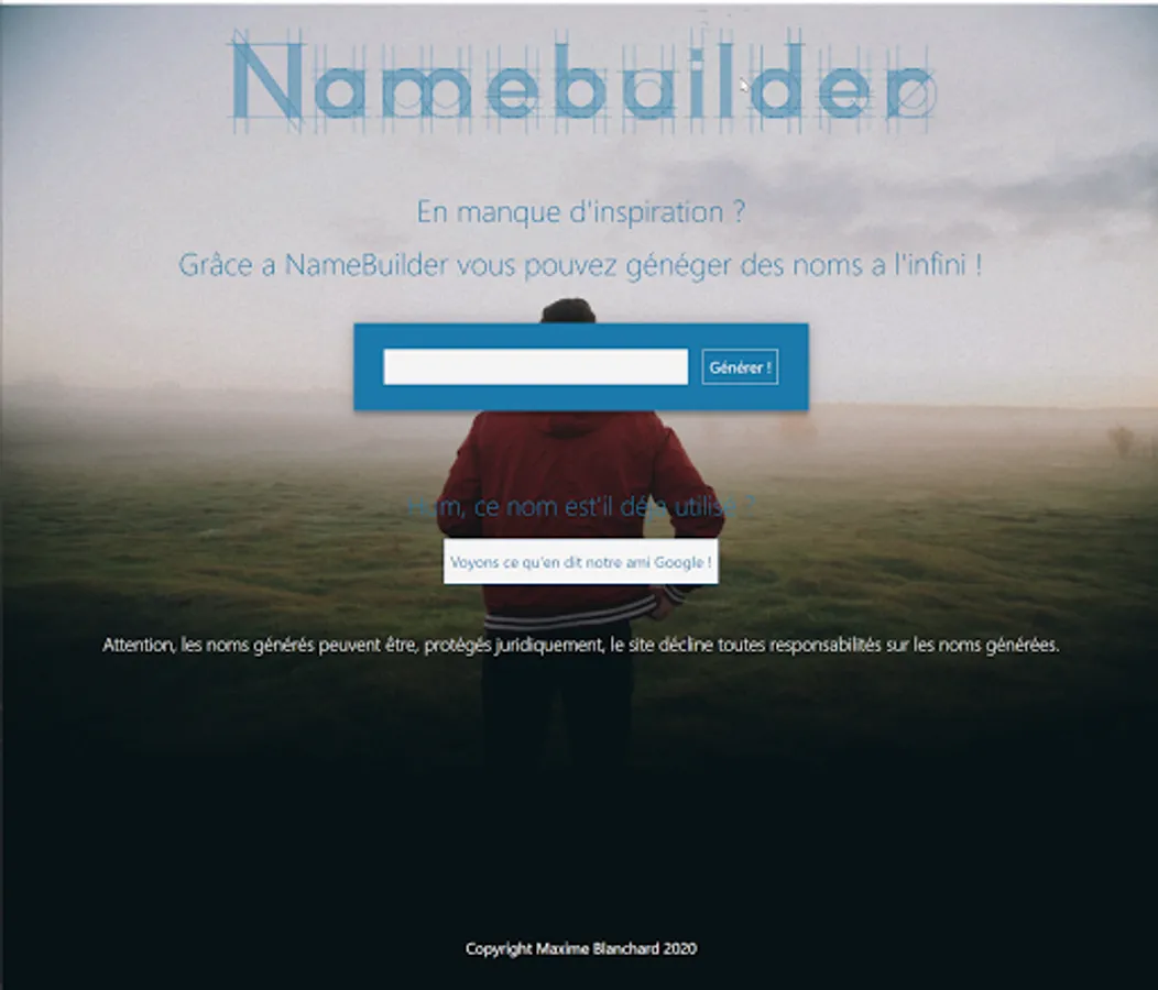 Please note that the generated names may be legally protected, the application, the site, or the developers declines all responsibility for the generated names.