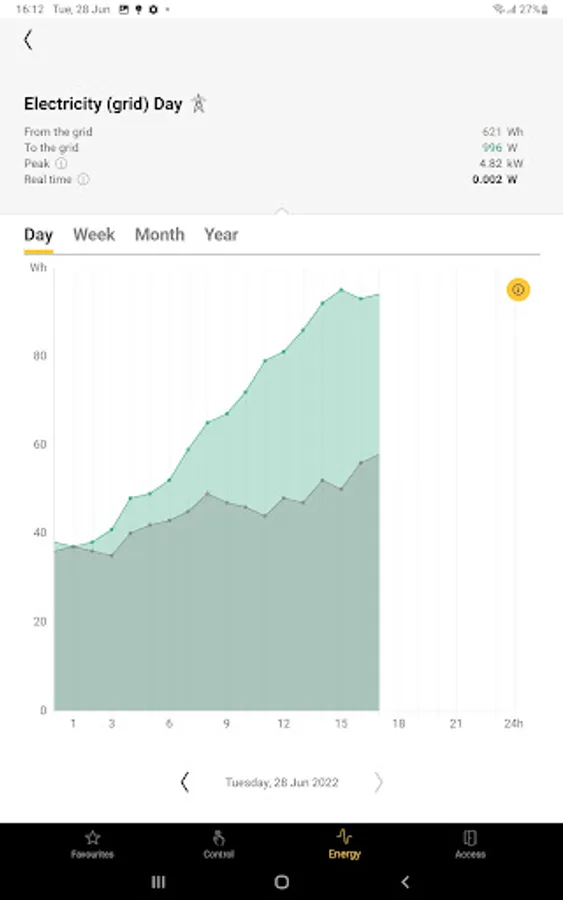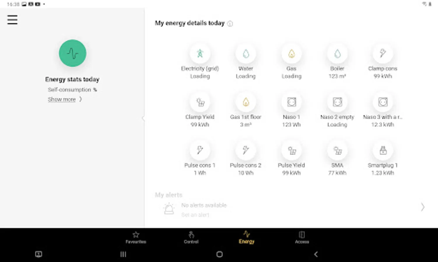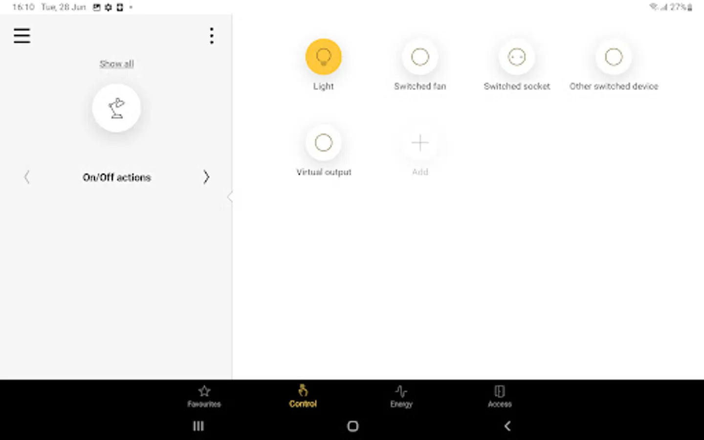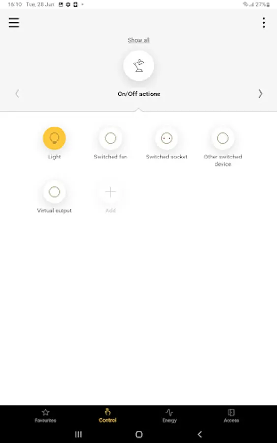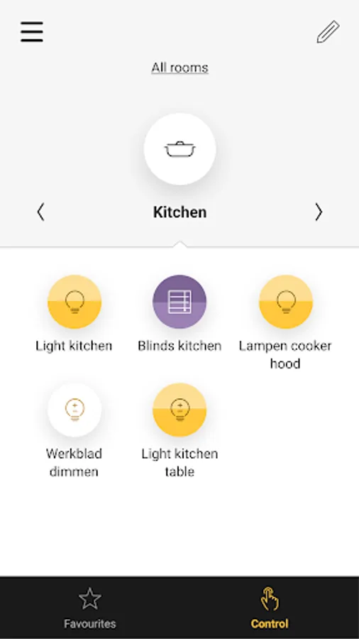 All controls are listed per room. Remotely control your (dimmed) lights, ventilation, roll-down shutters or sun blinds. Instant feedback.