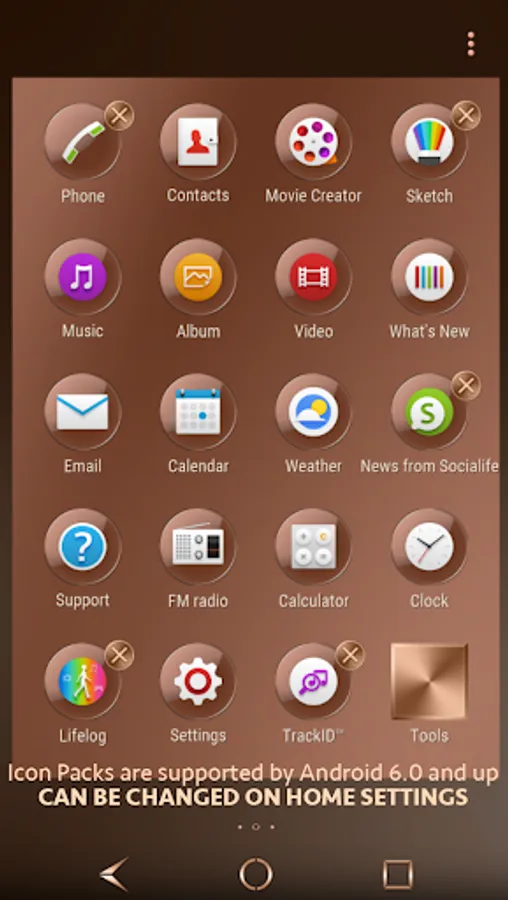 Designed with Sony Theme Creator for Xperia and based on the Rosé Gold theme framework it fully supports Marshmallow, Lollipop and KitKat, although some assets may differ between the versions. The copper colors have been sampled from pictures of the Copper Xperia Z3 and real copper ingots.