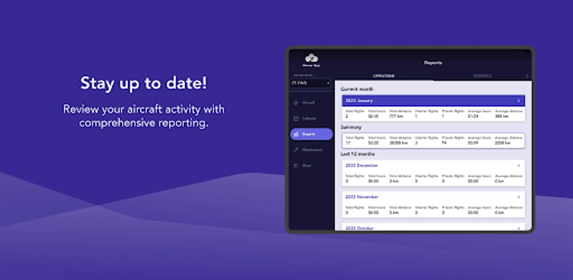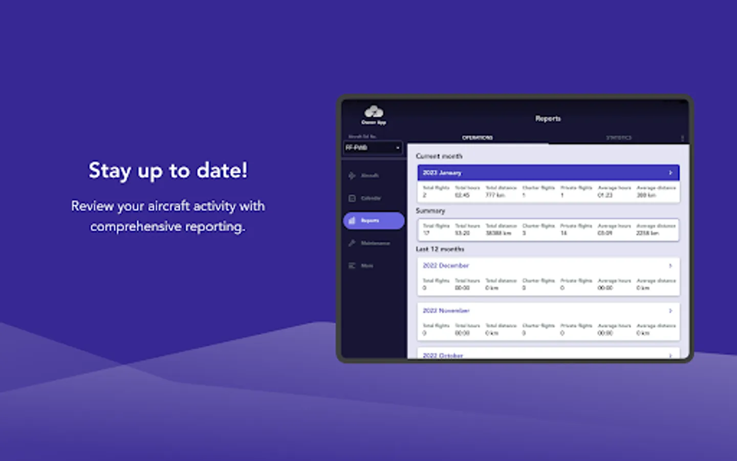 The application is aimed at providing aircraft owners with up-to-date information about the schedule, maintenance data and aircraft availability as well as comprehensive reporting and statistics of the operations that the aircraft has been involved in.
