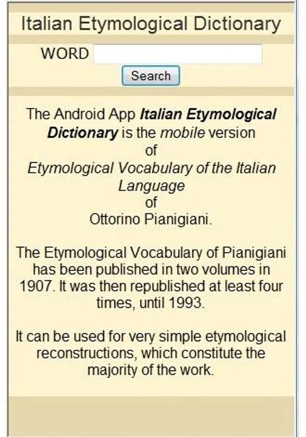 The Android App "Italian Etymological Dictionary" is the mobile version of Etymological Vocabulary of the Italian Language of Ottorino Pianigiani.