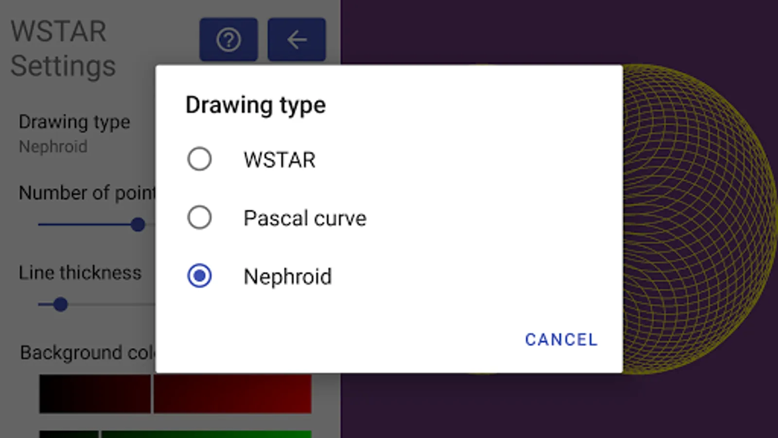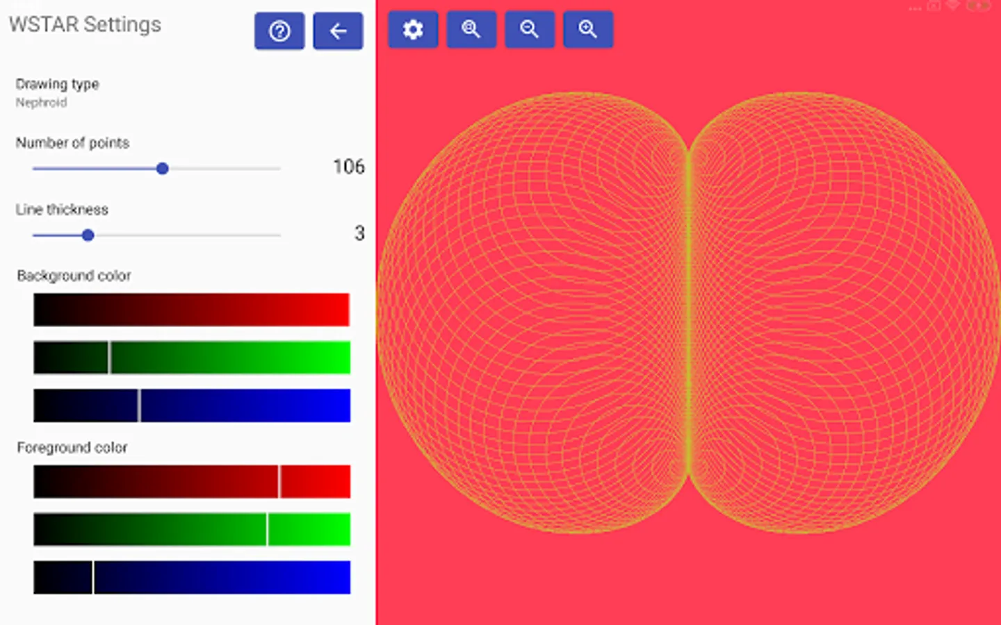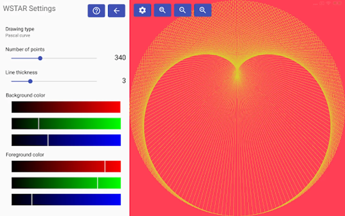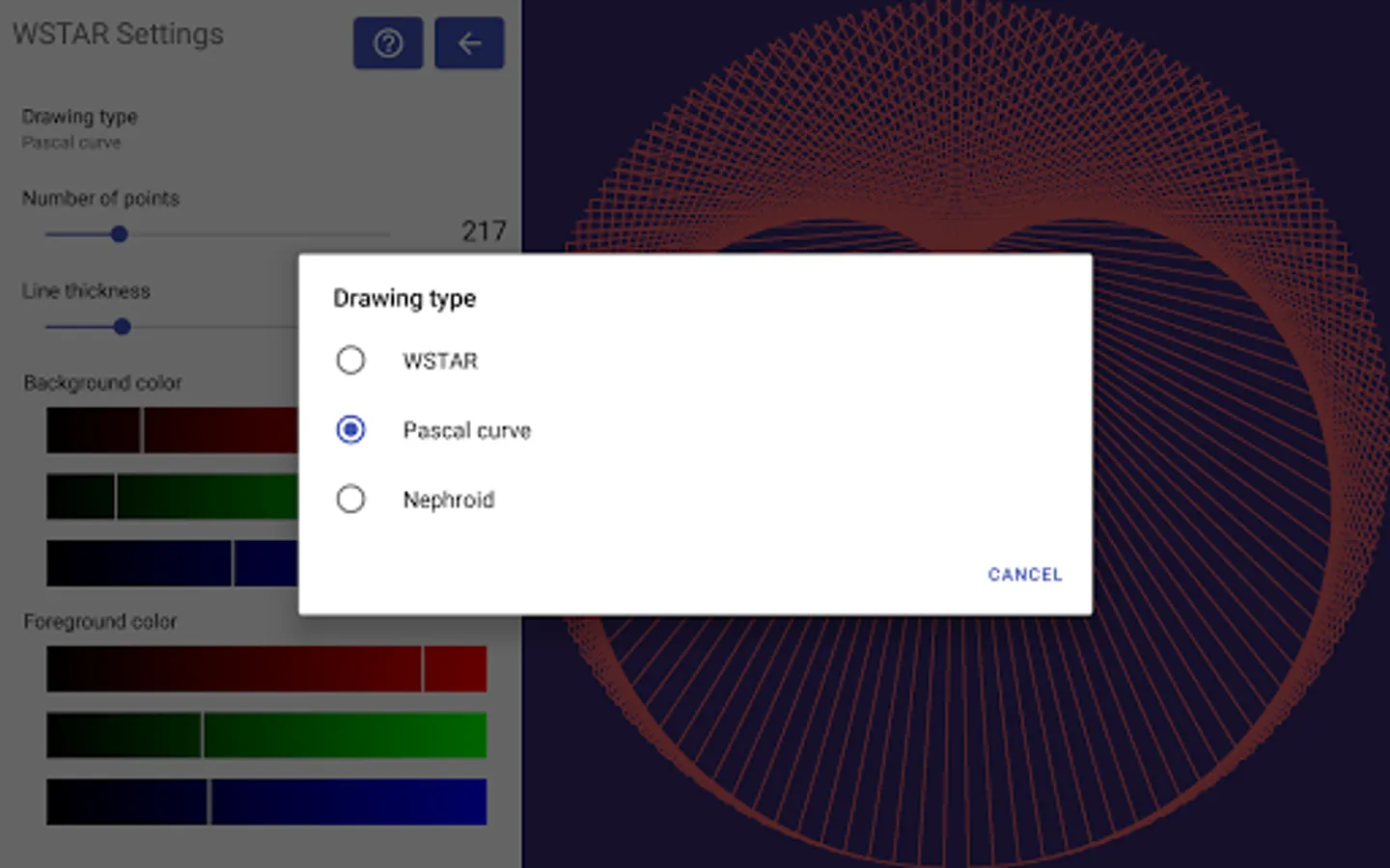This is my favorite pet application. I call it WSTAR. It has many variations, the original WSTAR, the Pascal curve and the Nephroid, and now even this pay version that combines them all.