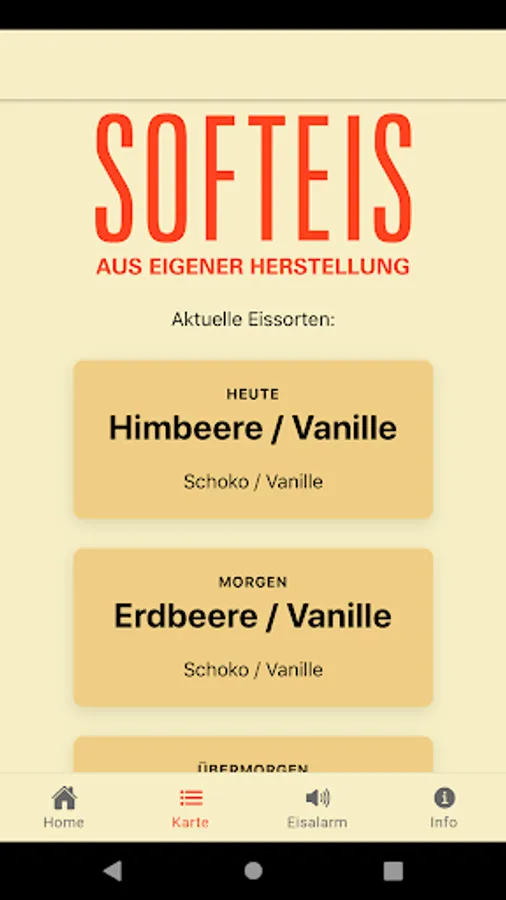 Shows the daily changing variety of soft ice cream shops in Leipzig's Waldstrasse district and notifies you when your favorite variety is on sale.