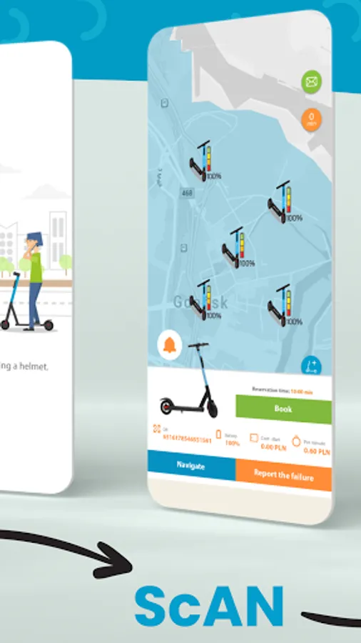 We do not charge a starting fee, and each commenced minute of rental is PLN 0.60. Additionally, we can book a scooter (PLN 0.10 / min) and pause the ride (PLN 0.10 / min). The final fee of PLN 3 is charged if the User does not leave the scooter at the designated place (letter P on the map in the application). We offer packages and promotions that significantly reduce the total cost of travel.