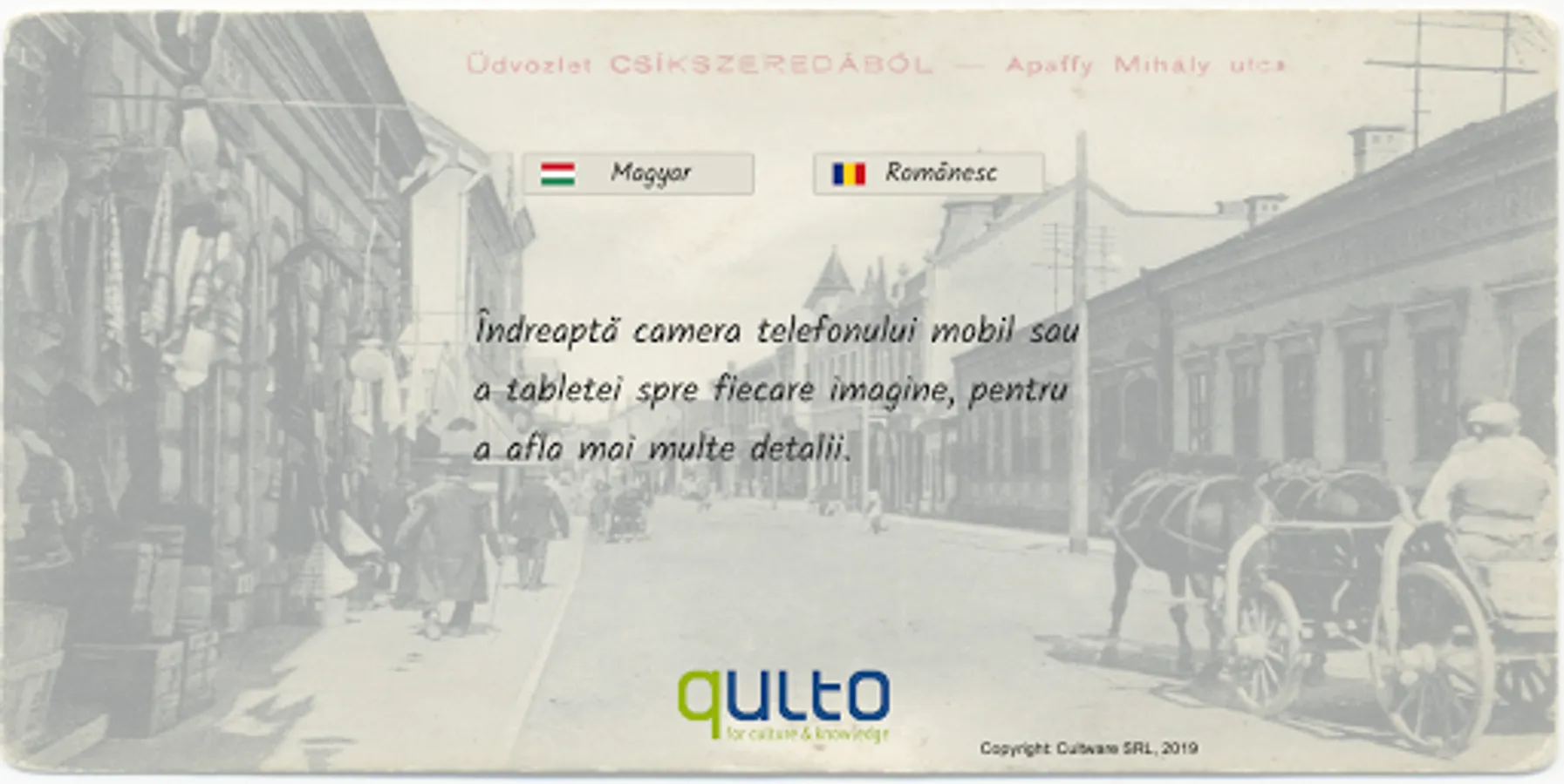 After opening the homepage, touch the screen and the device's camera will automatically activate. Point the camera at one of the photos to discover details about the image, in text or sound.
